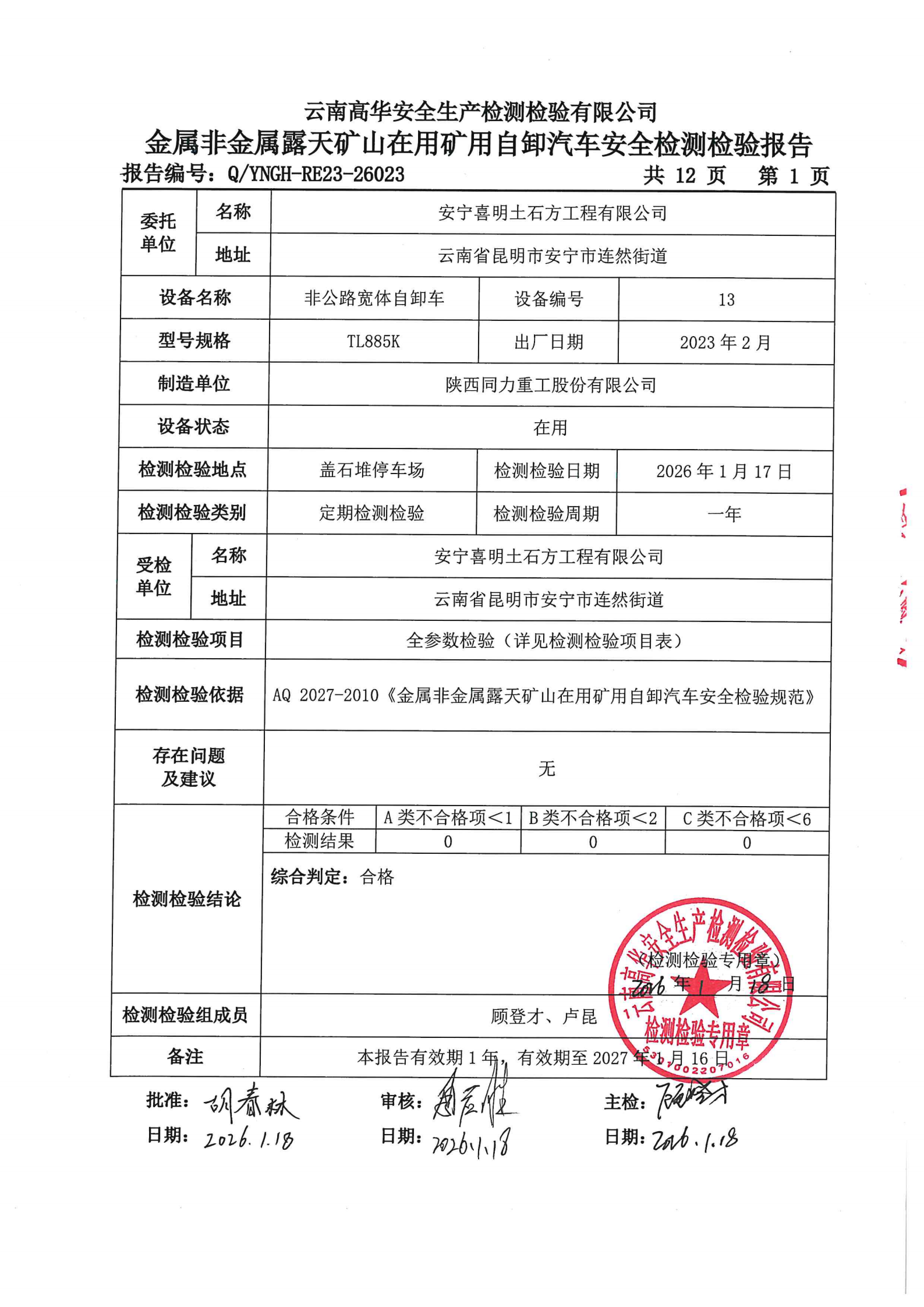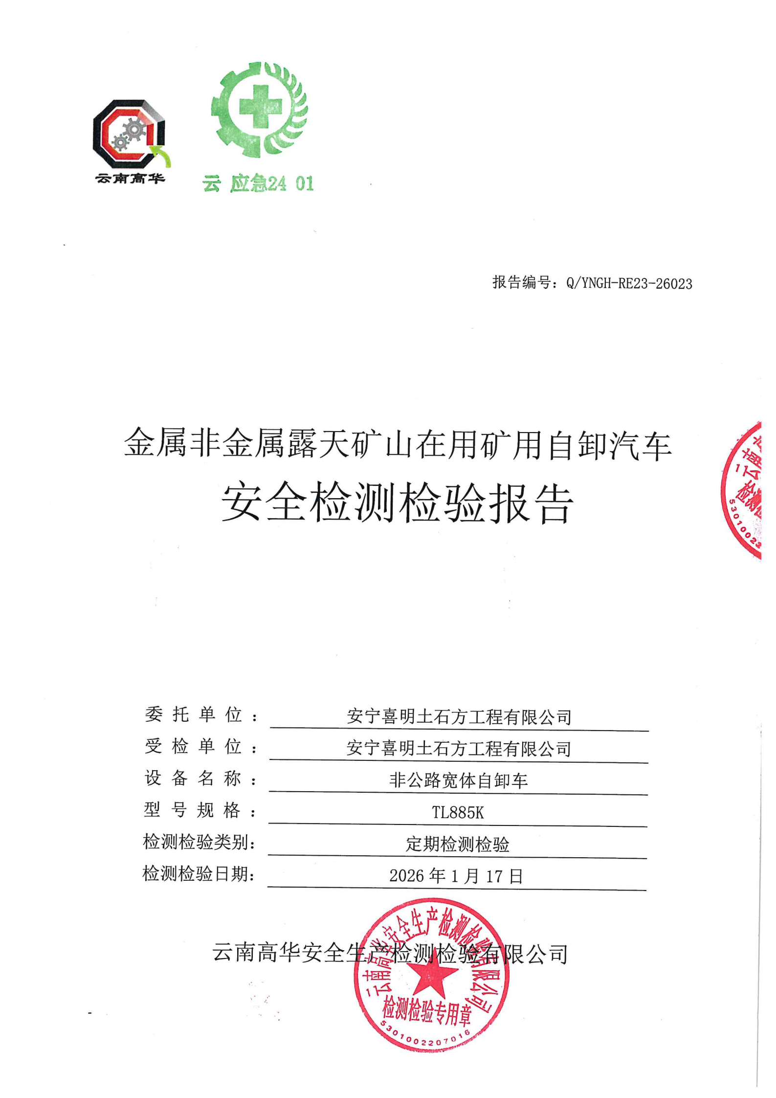 金属非金属露天矿山在用矿用自卸汽车安全检测检验报告