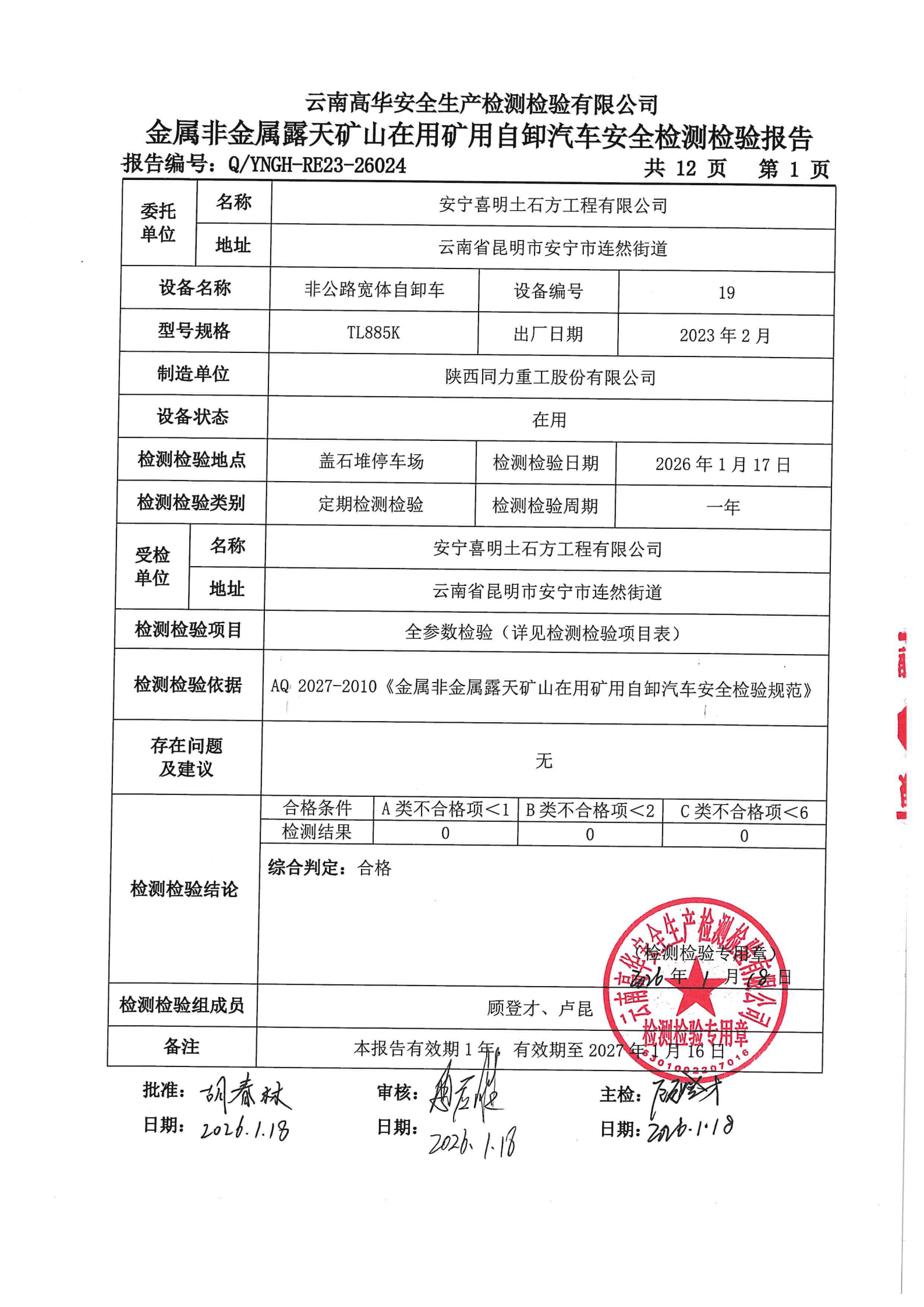 金属非金属露天矿山在用矿用自卸汽车安全检测检验报告