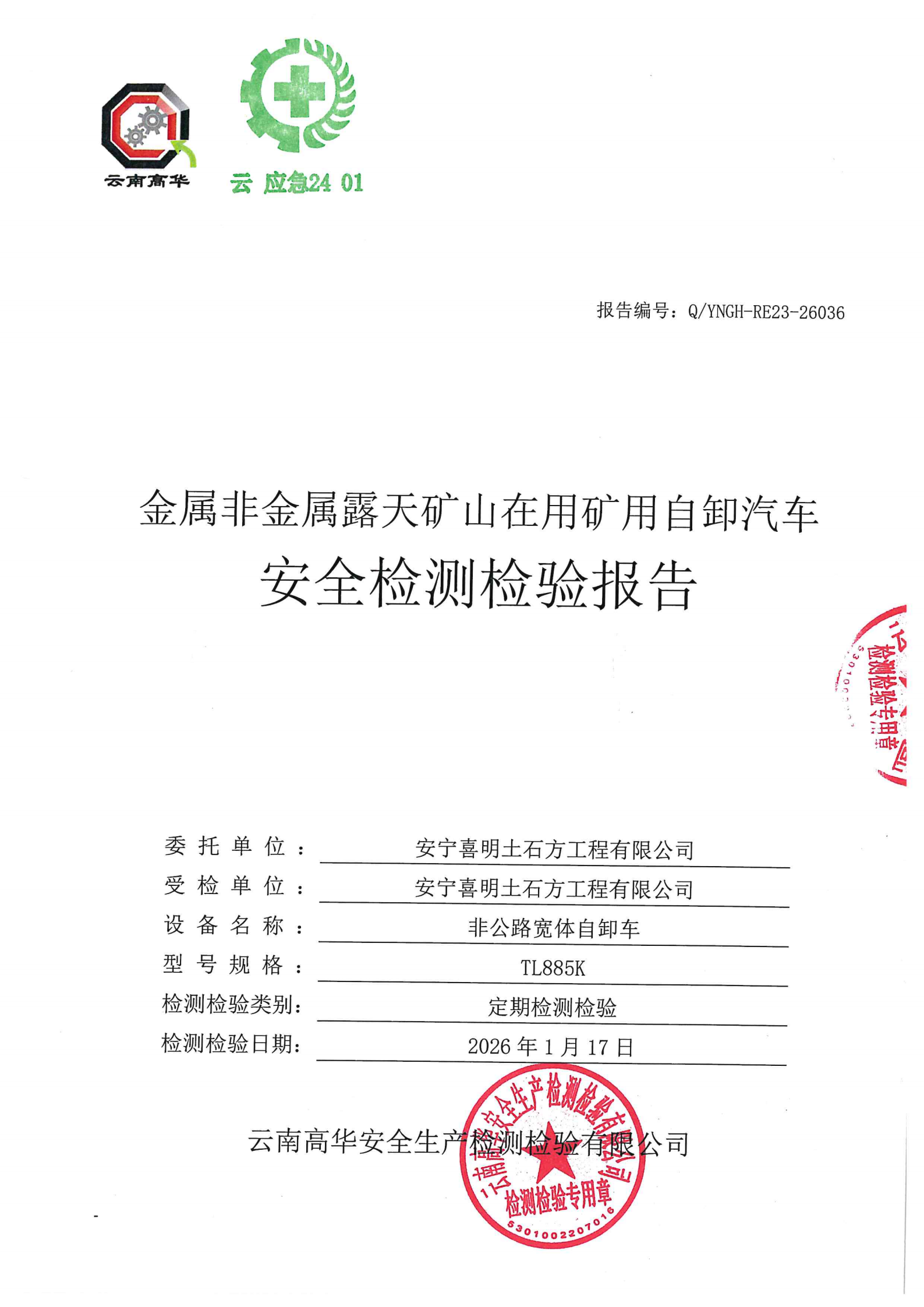 金属非金属矿山在用矿用自卸汽车安全检测检验报告