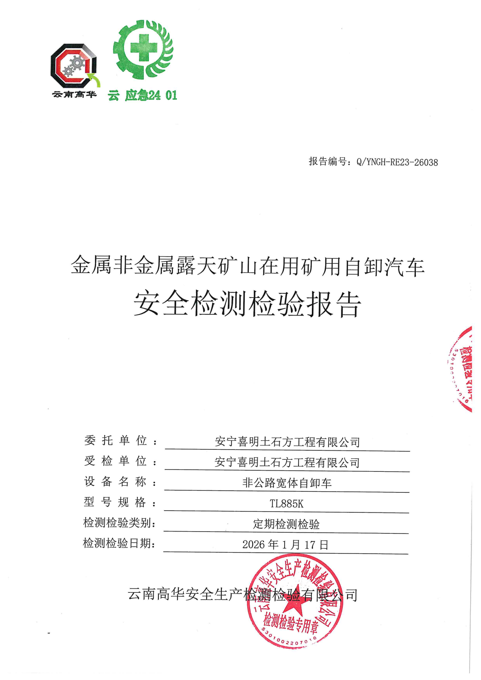 金属非金属矿山在用矿用自卸汽车安全检测检验报告