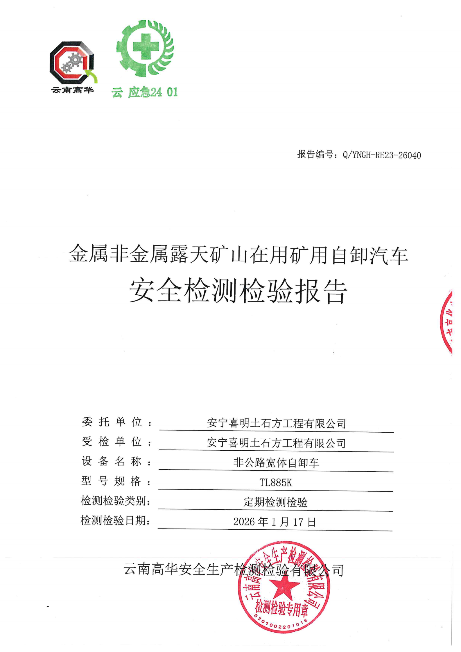 金属非金属矿山在用矿用自卸汽车安全检测检验报告