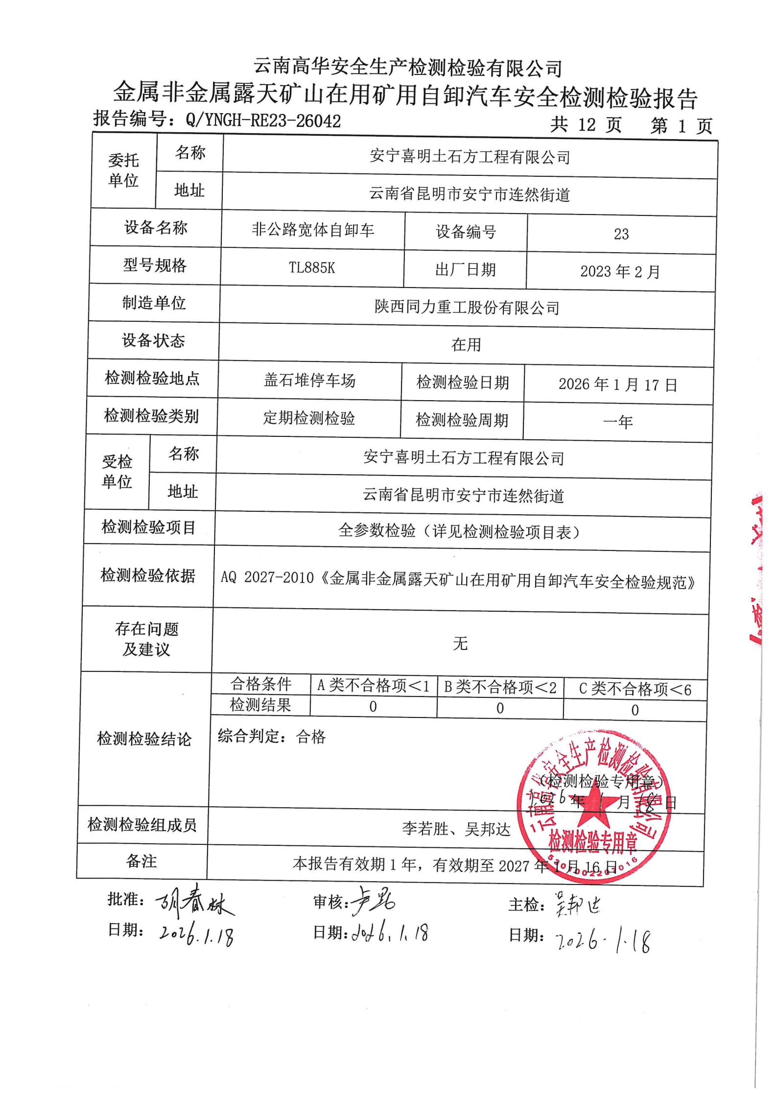 金属非金属露天矿山在用矿用自卸汽车安全检测检验报告