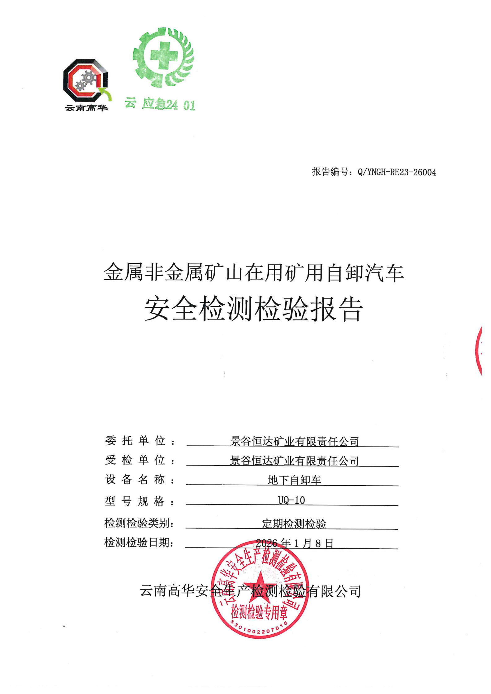 金属非金属矿山在用矿用自卸汽车安全检测检验报告