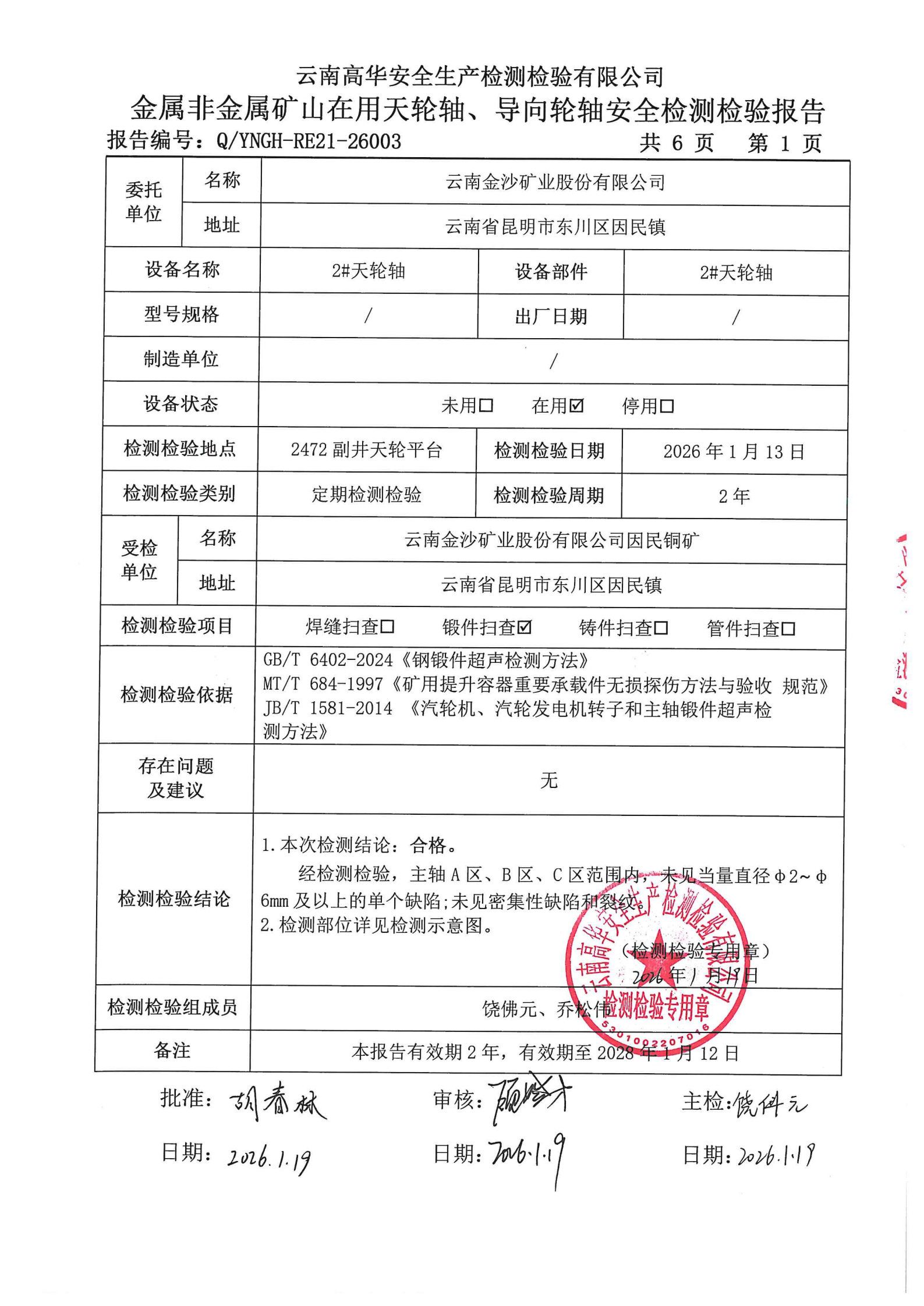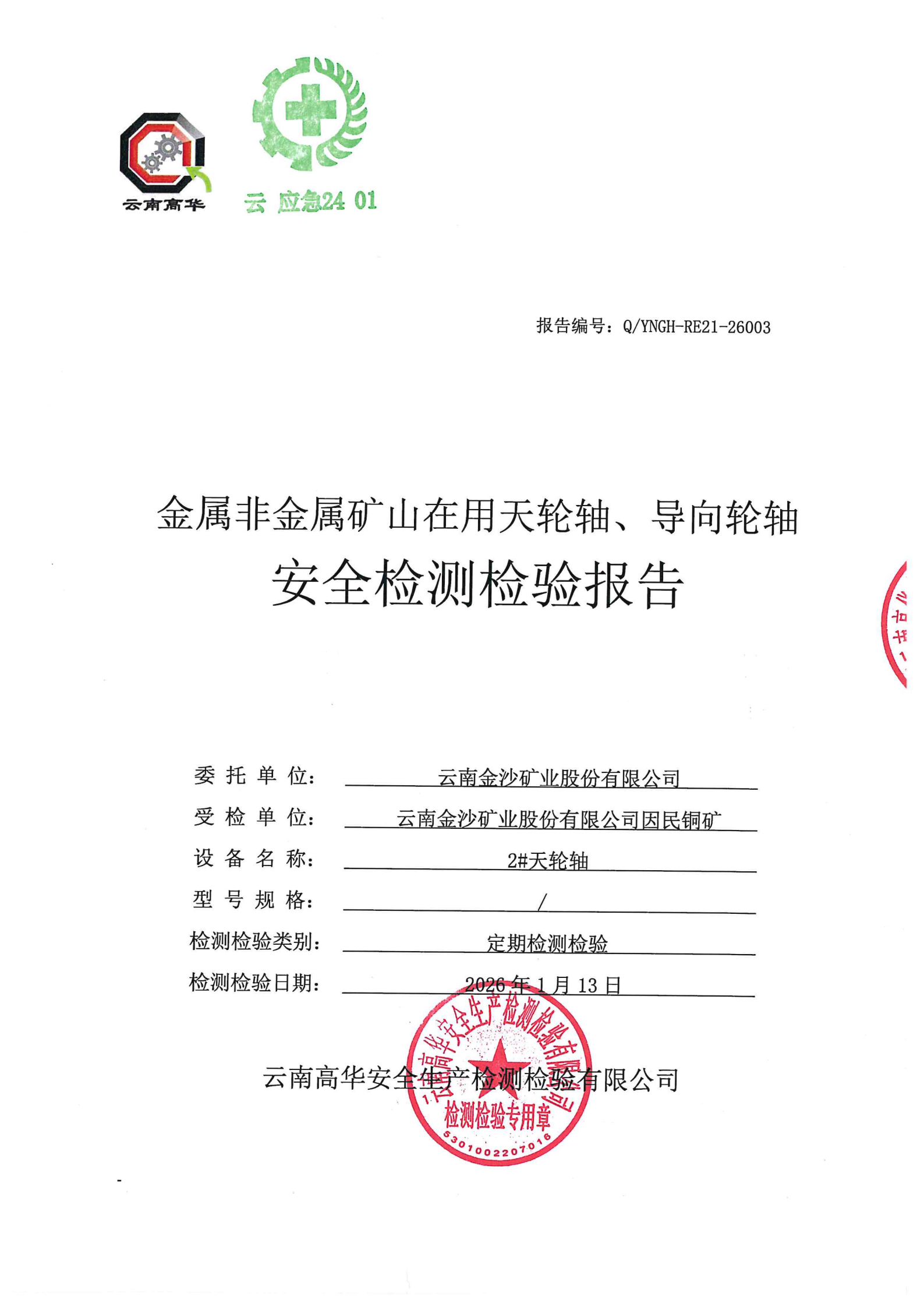 金属非金属矿山在用天轮轴、导向轮轴安全检测检验报告