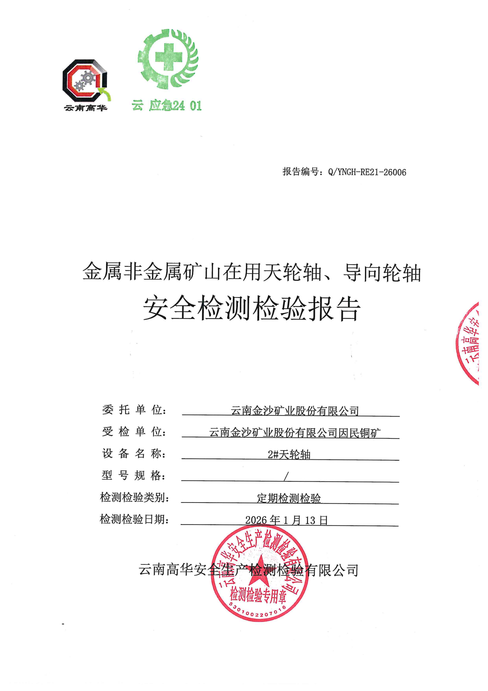 金属非金属矿山在用天轮轴、导向轮轴安全检测检验报告