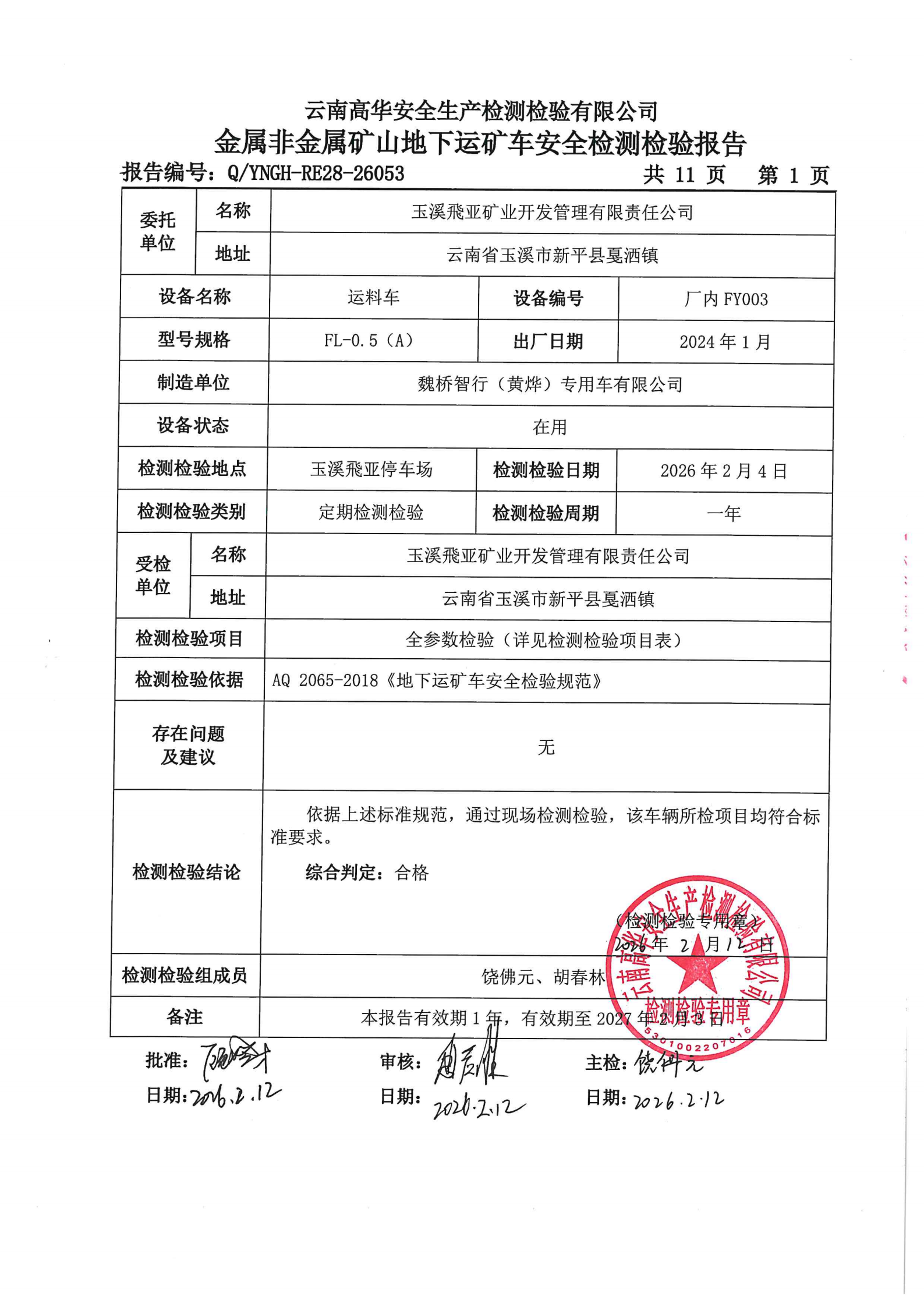 金属非金属矿山地下运矿车安全检测检验报告