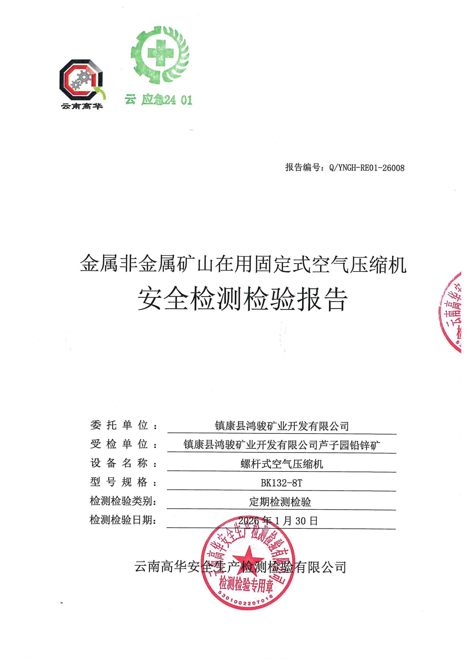 金属非金属矿山在用固定式空气压缩机安全检测检验报告