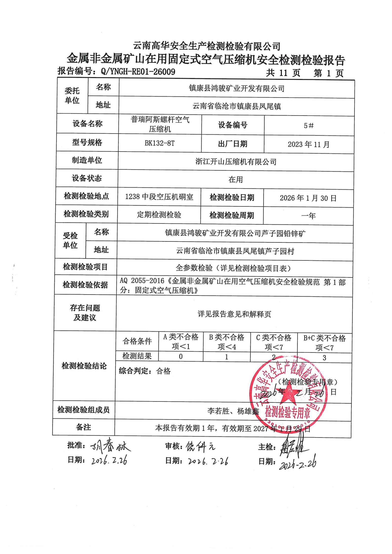 金属非金属矿山在用固定式空气压缩机安全检测检验报告