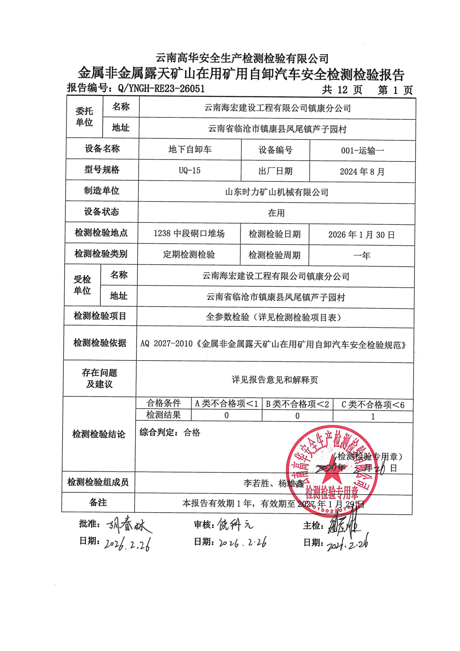 金属非金属露天矿山在用矿用自卸汽车安全检测检验报告