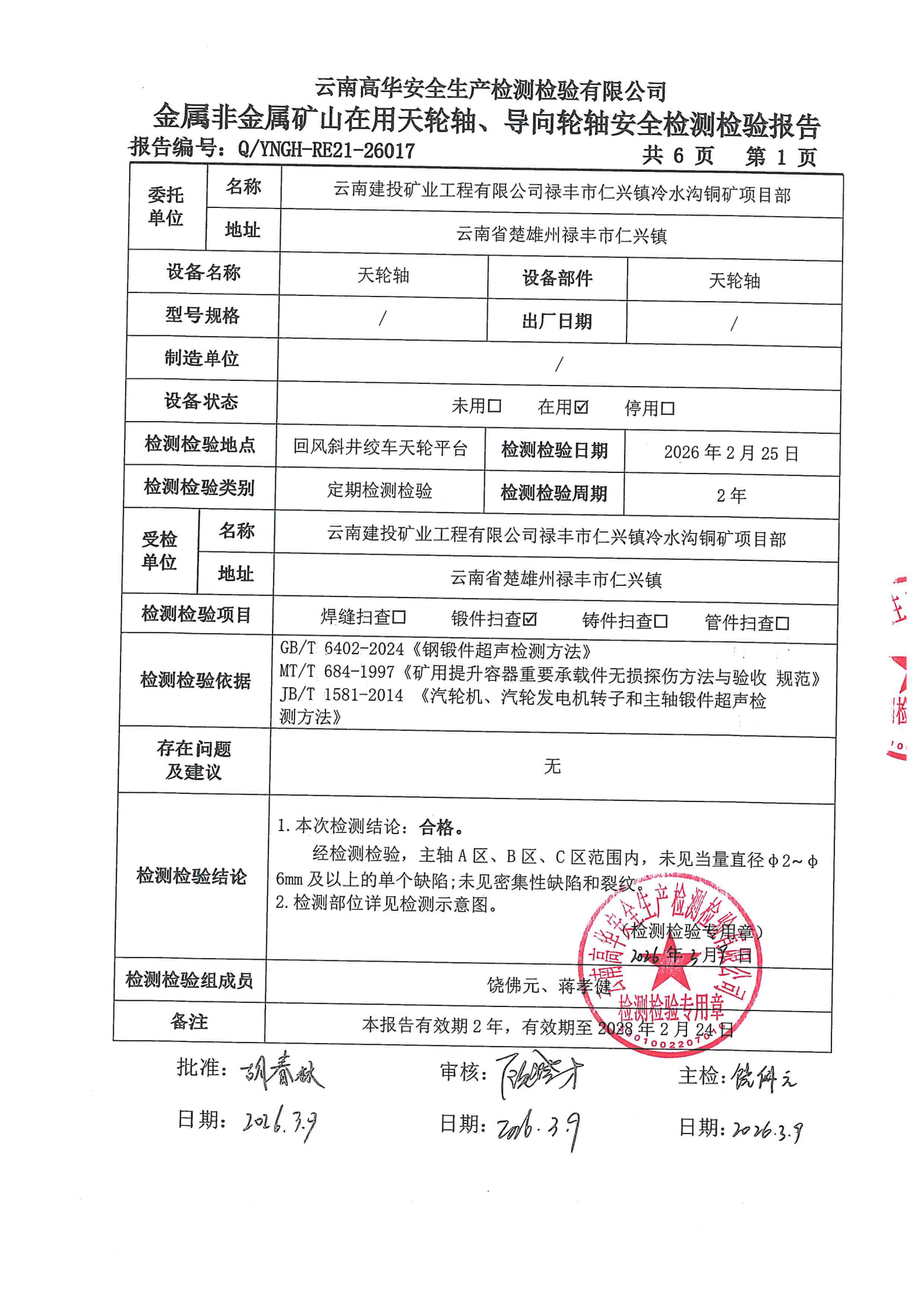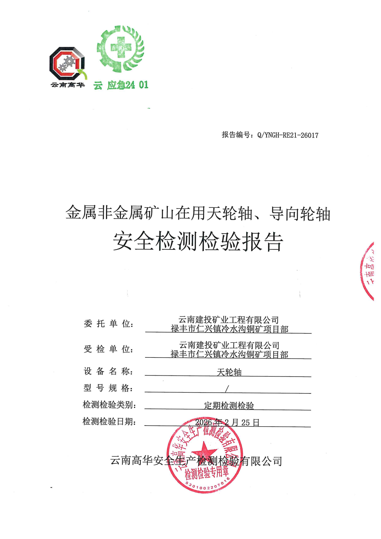 金属非金属矿山在用天轮轴、导向轮轴安全检测检验报告