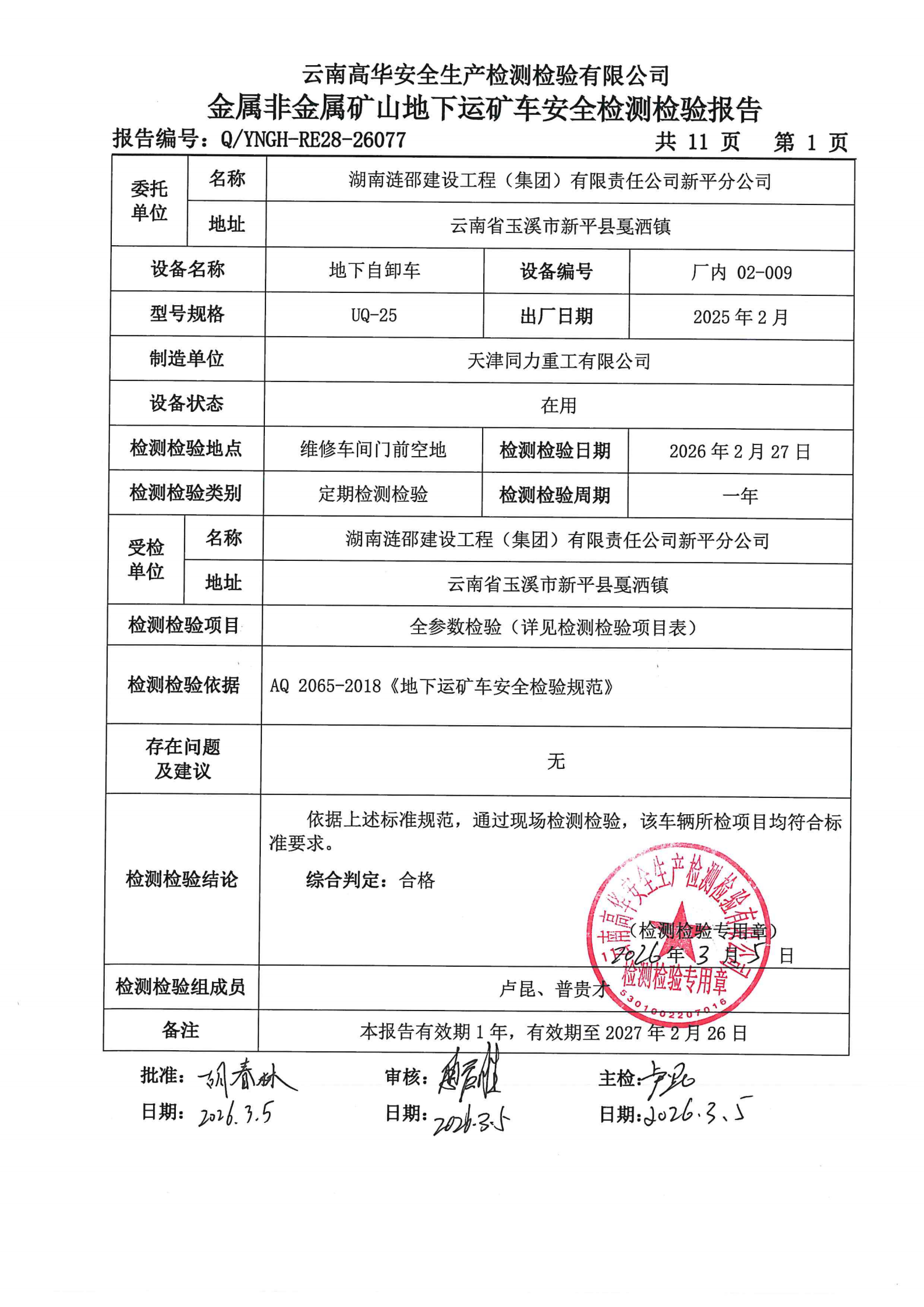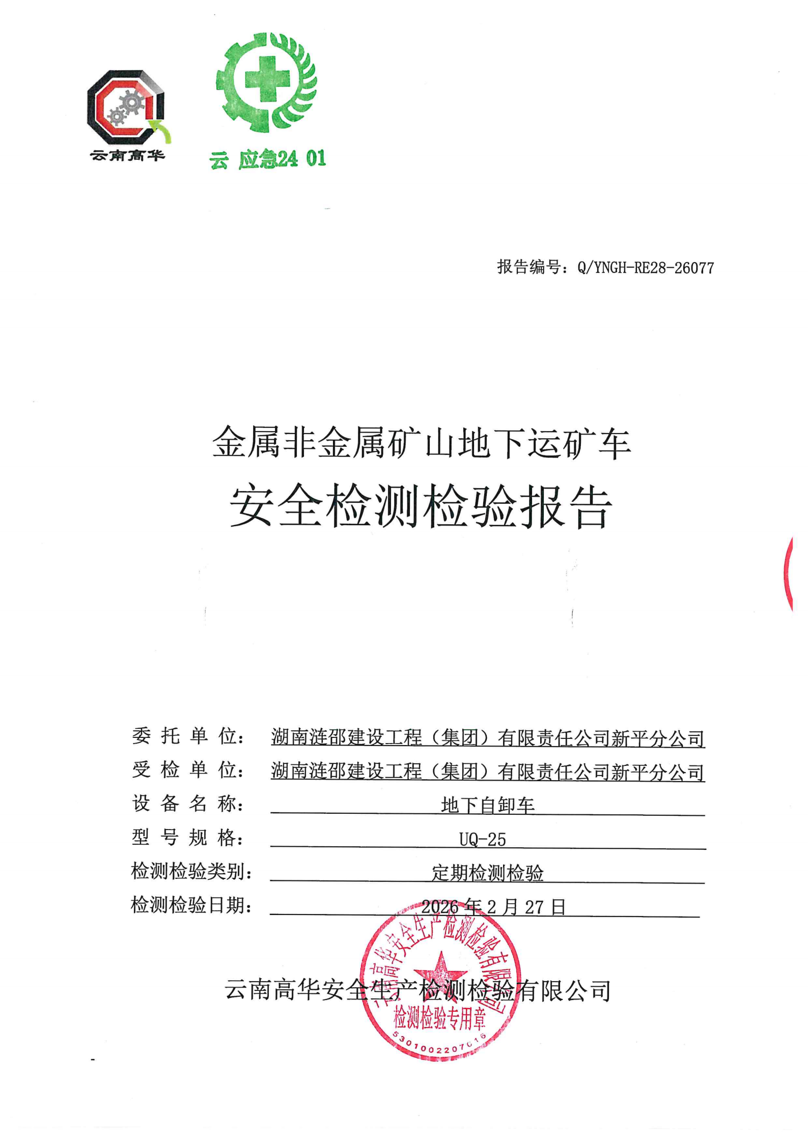 金属非金属矿山地下运矿车安全检测检验报告