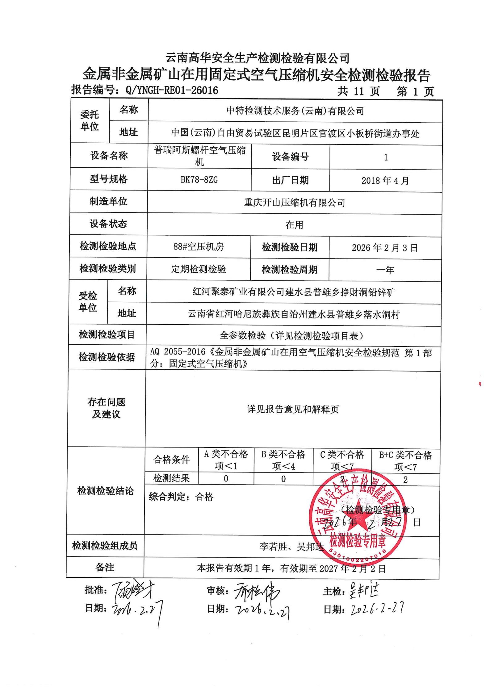 金属非金属矿山在用固定式空气压缩机安全检测检验报告