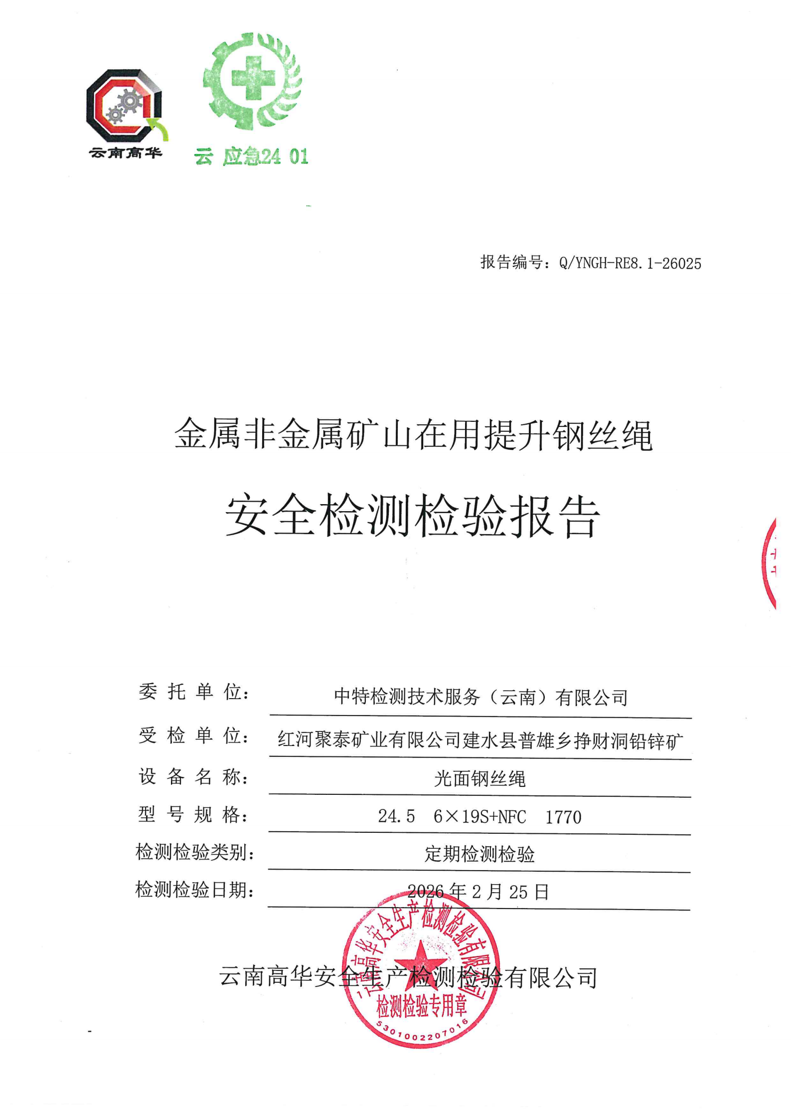 金属非金属矿山在用提升钢丝绳安全检测检验报告
