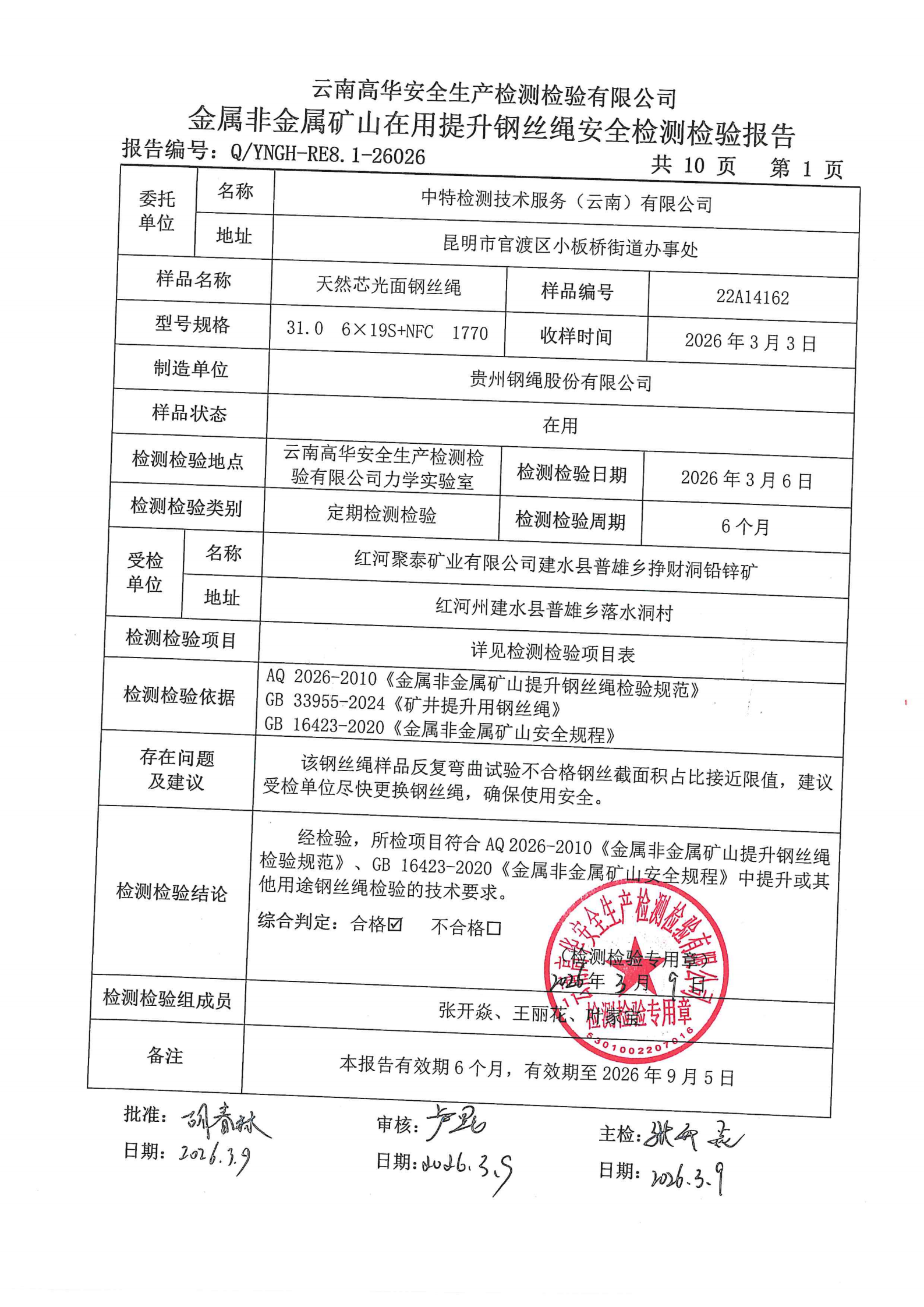 金属非金属矿山在用提升钢丝绳安全检测检验报告