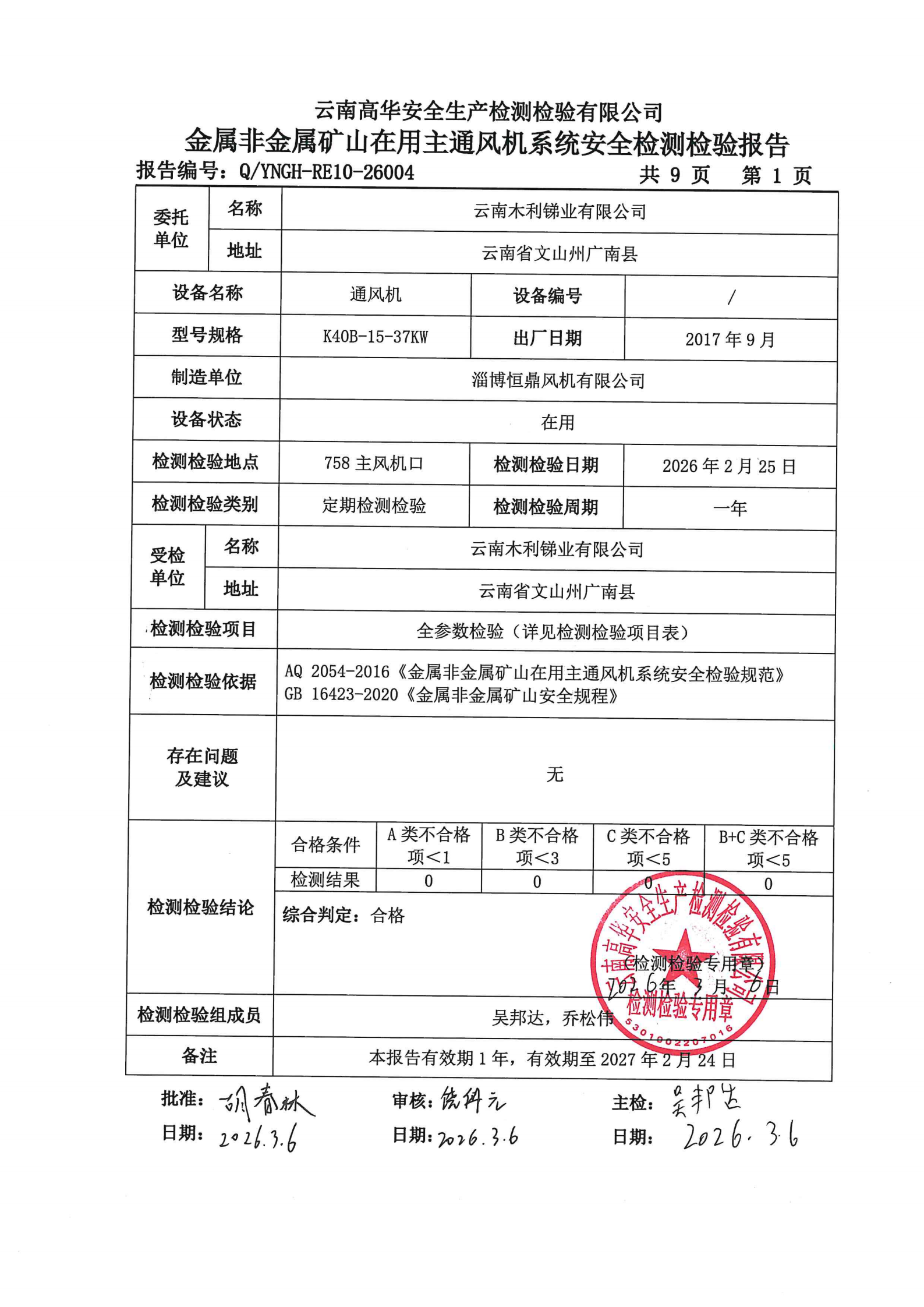金属非金属矿山在用主通风机系统安全检测检验报告
