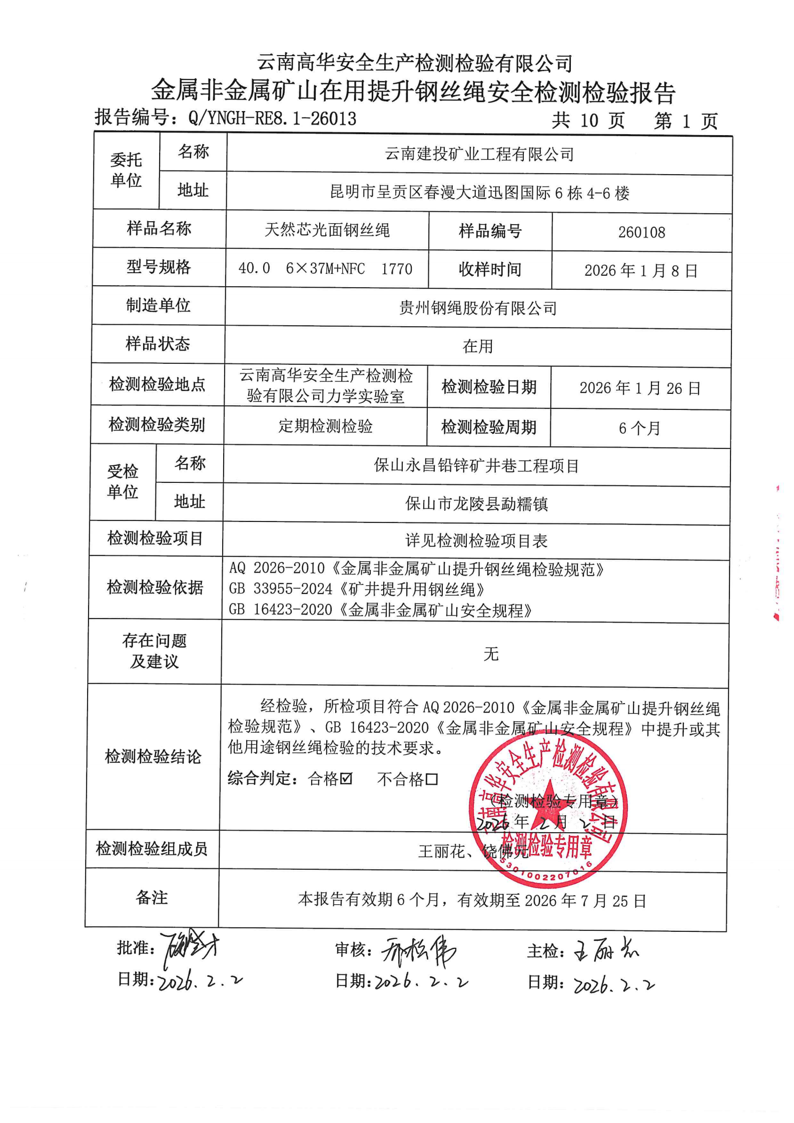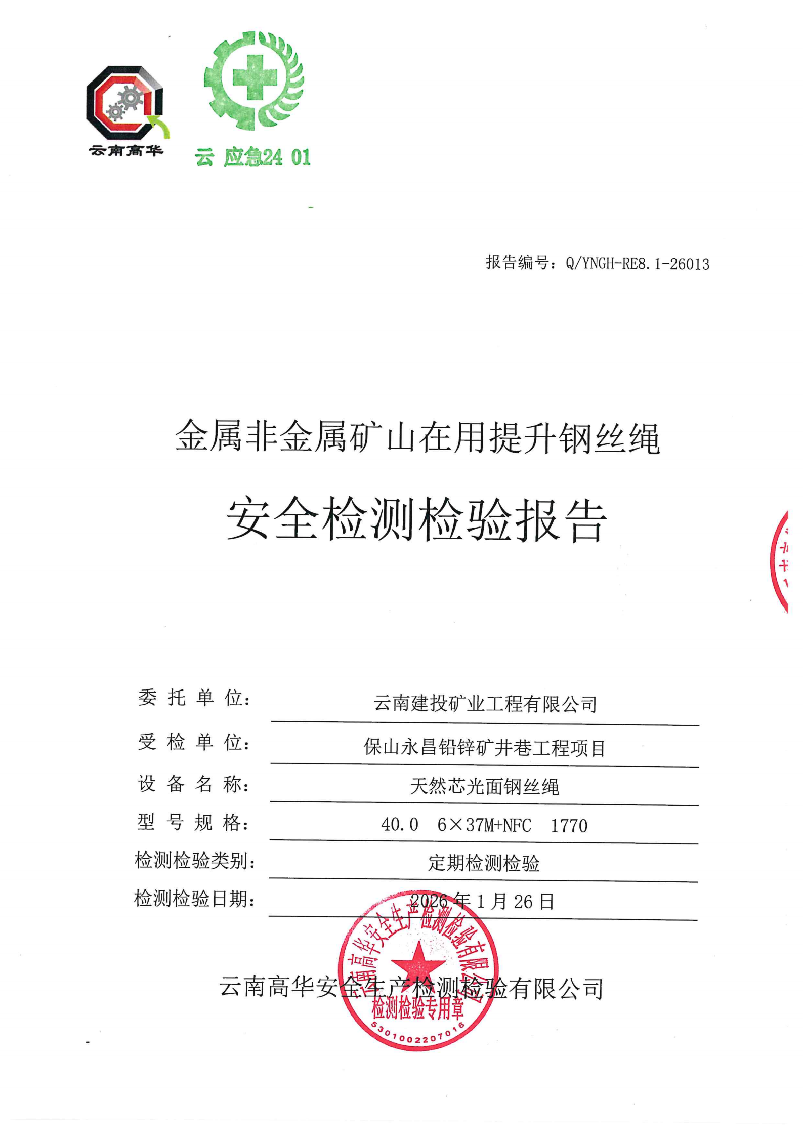 金属非金属矿山在用提升钢丝绳安全检测检验报告