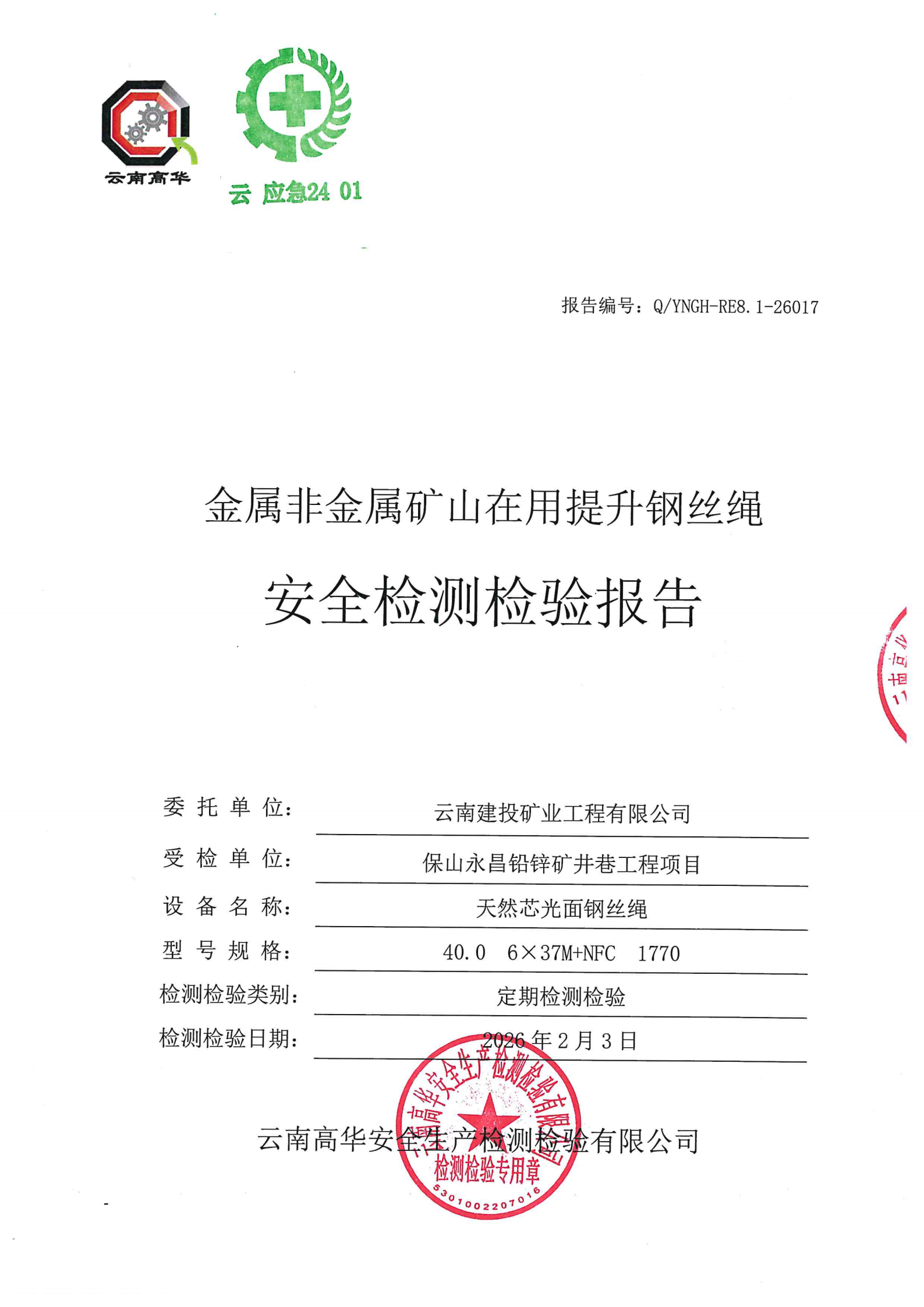 金属非金属矿山在用提升钢丝绳安全检测检验报告