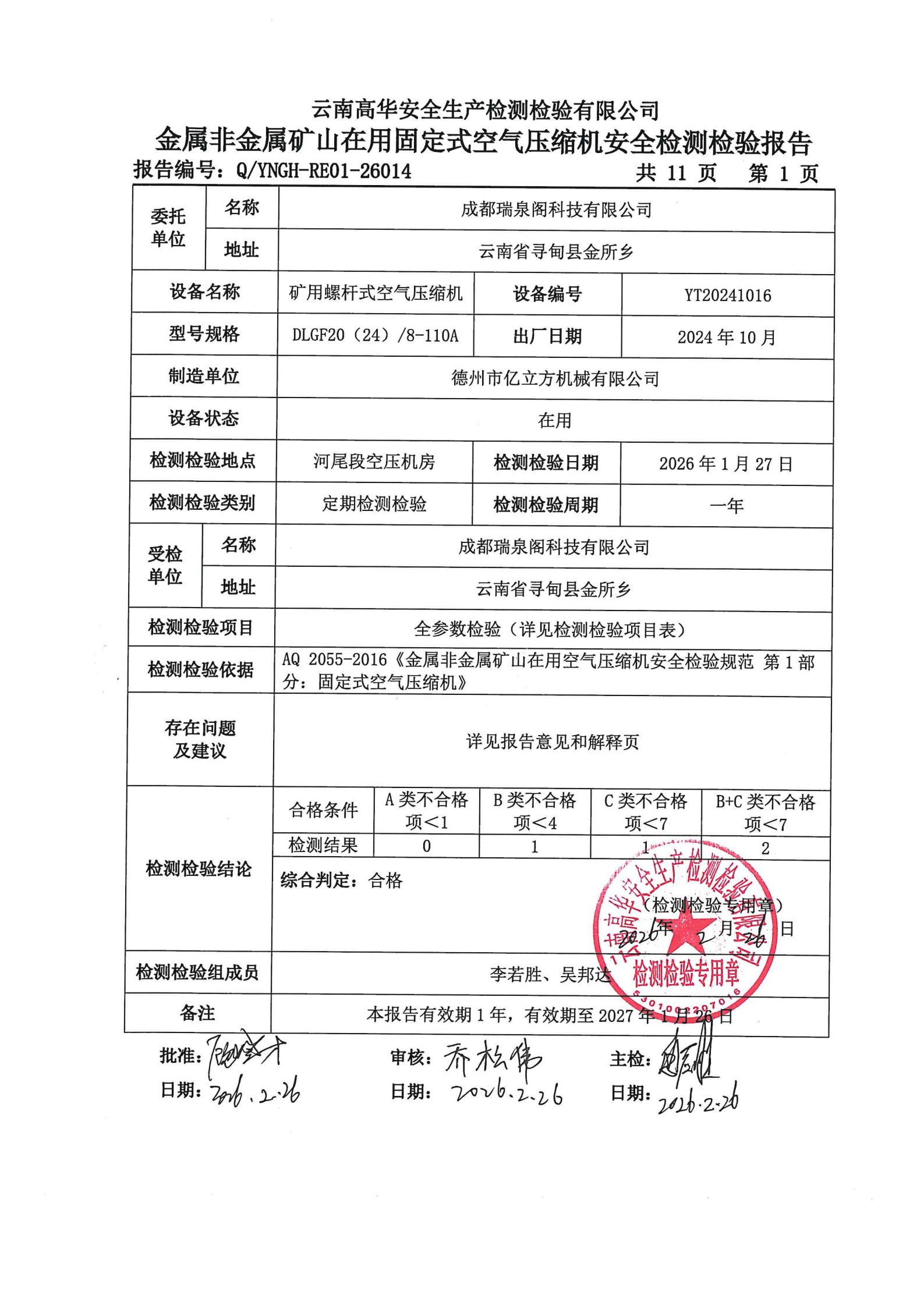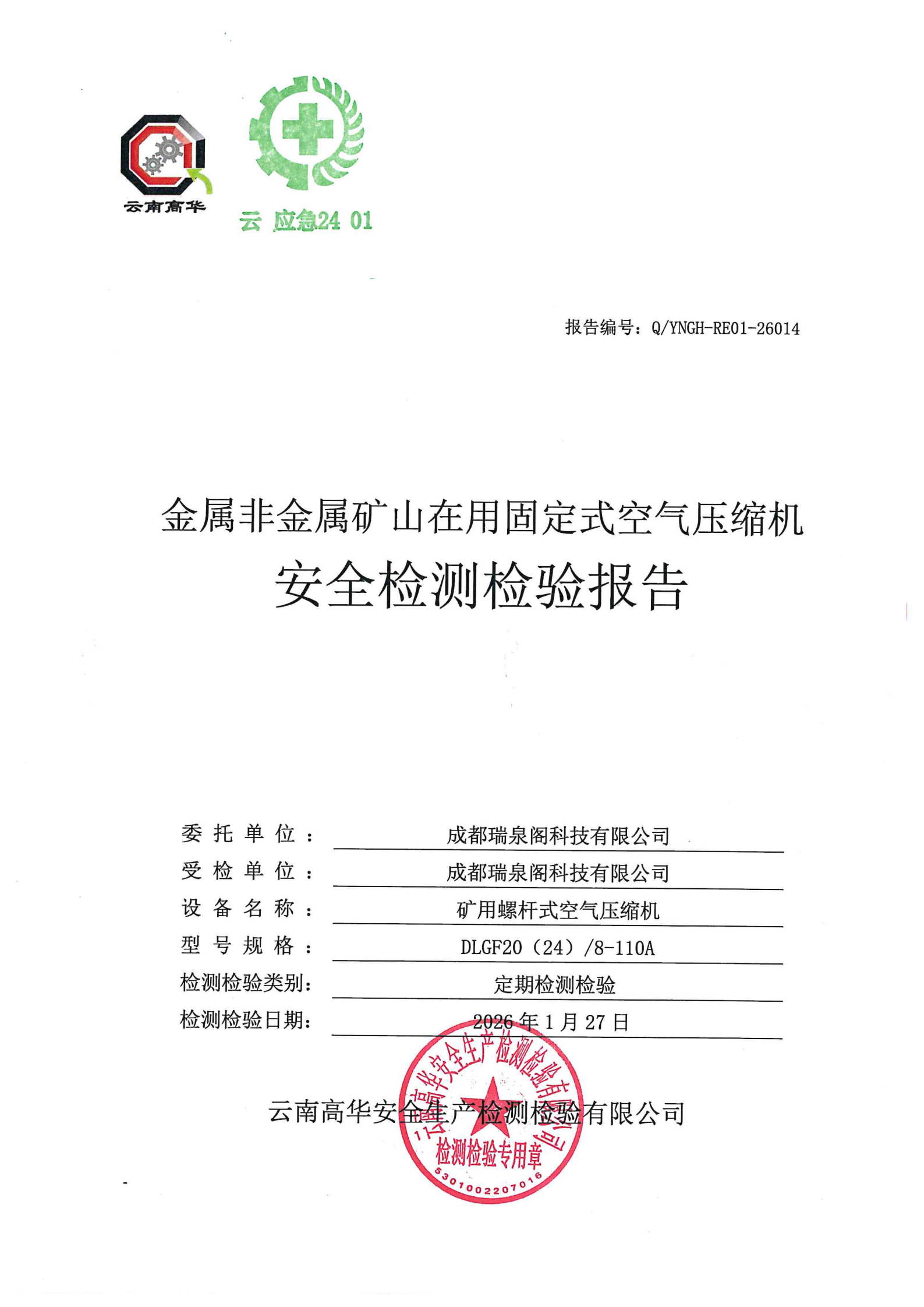 金属非金属矿山在用固定式空气压缩机安全检测检验报告