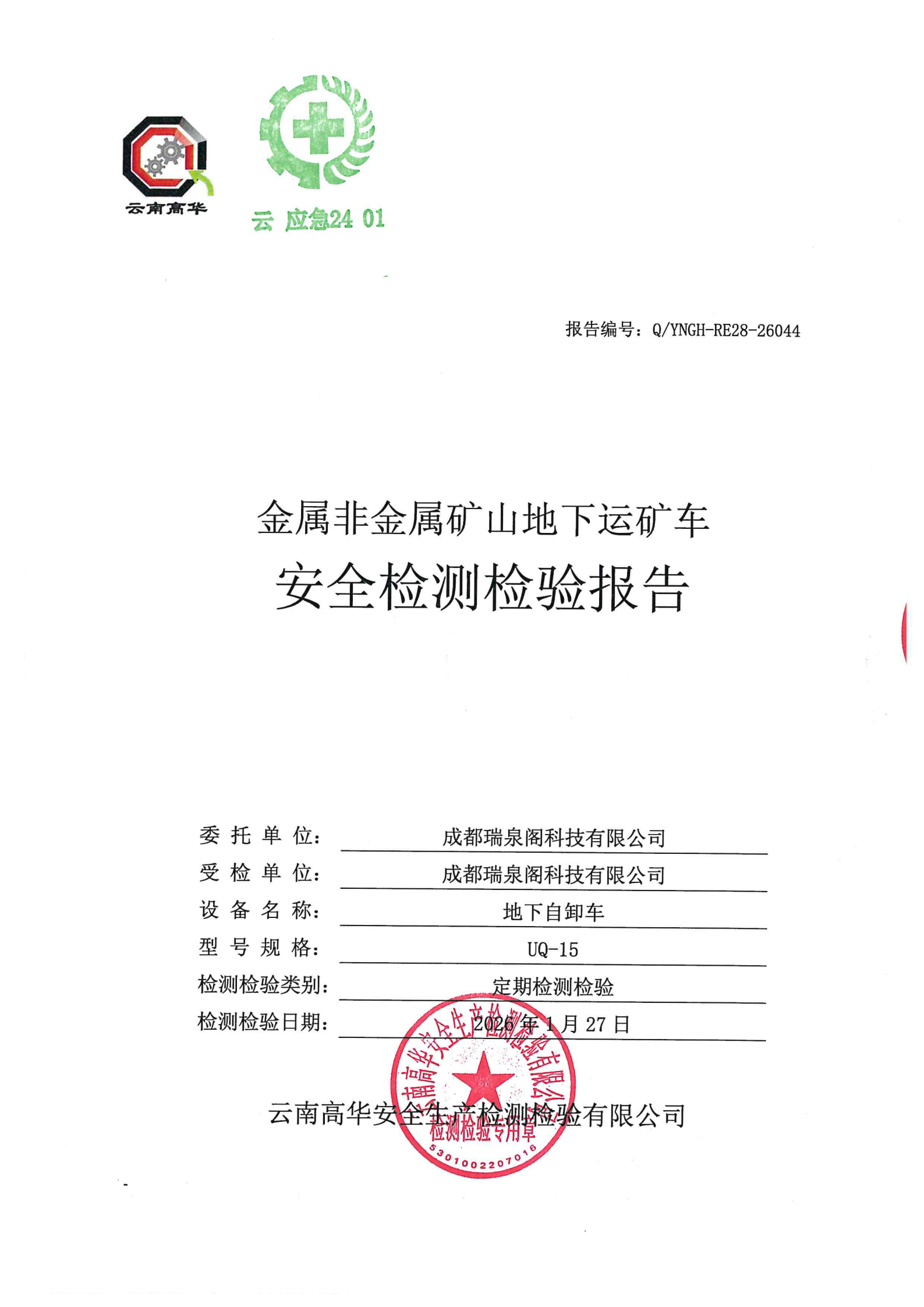 金属非金属矿山地下运矿车安全检测检验报告
