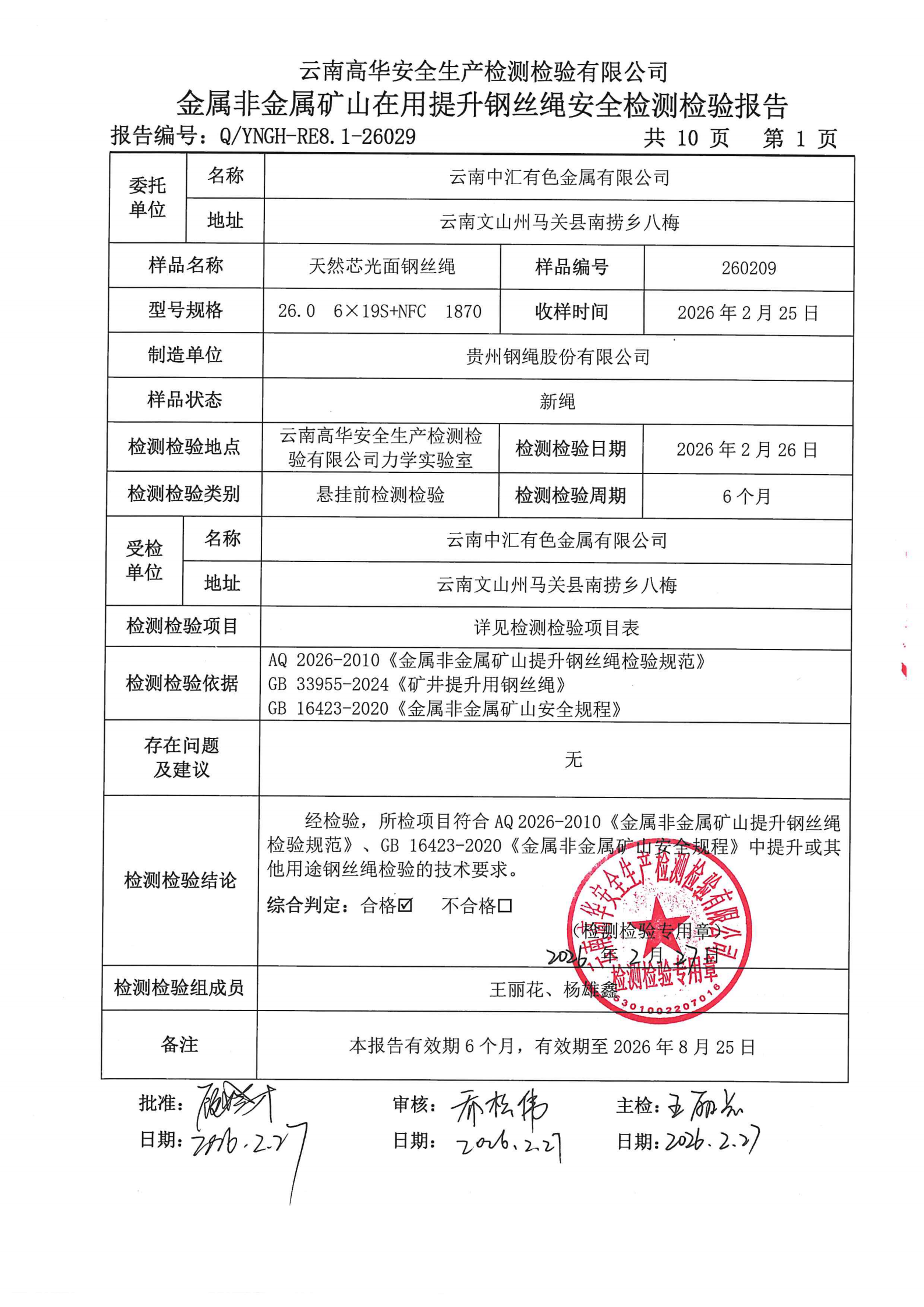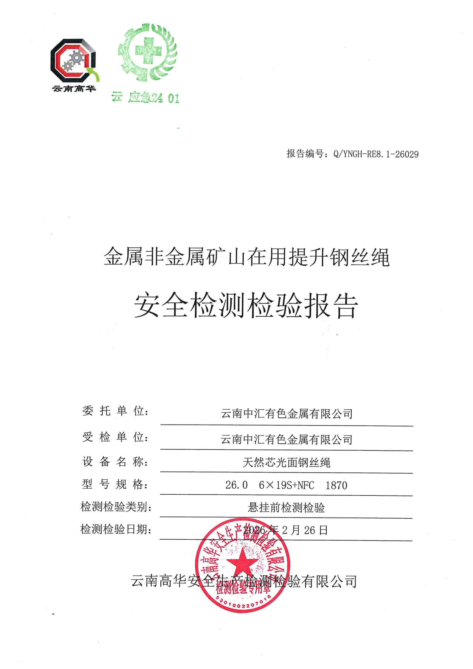 金属非金属矿山在用提升钢丝绳安全检测检验报告