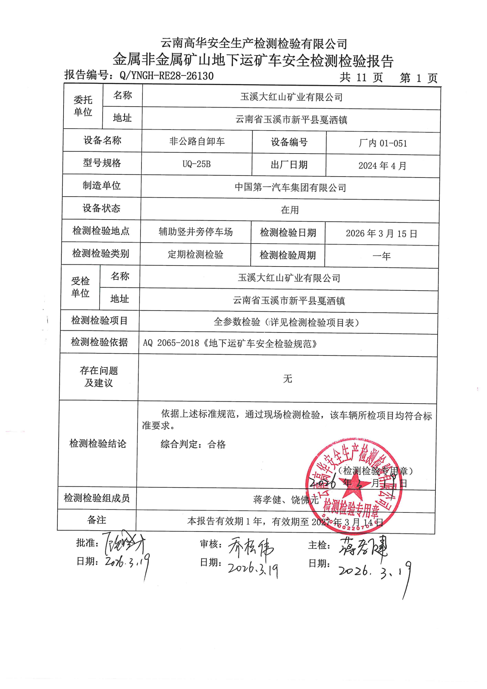 金属非金属矿山地下运矿车安全检测检验报告