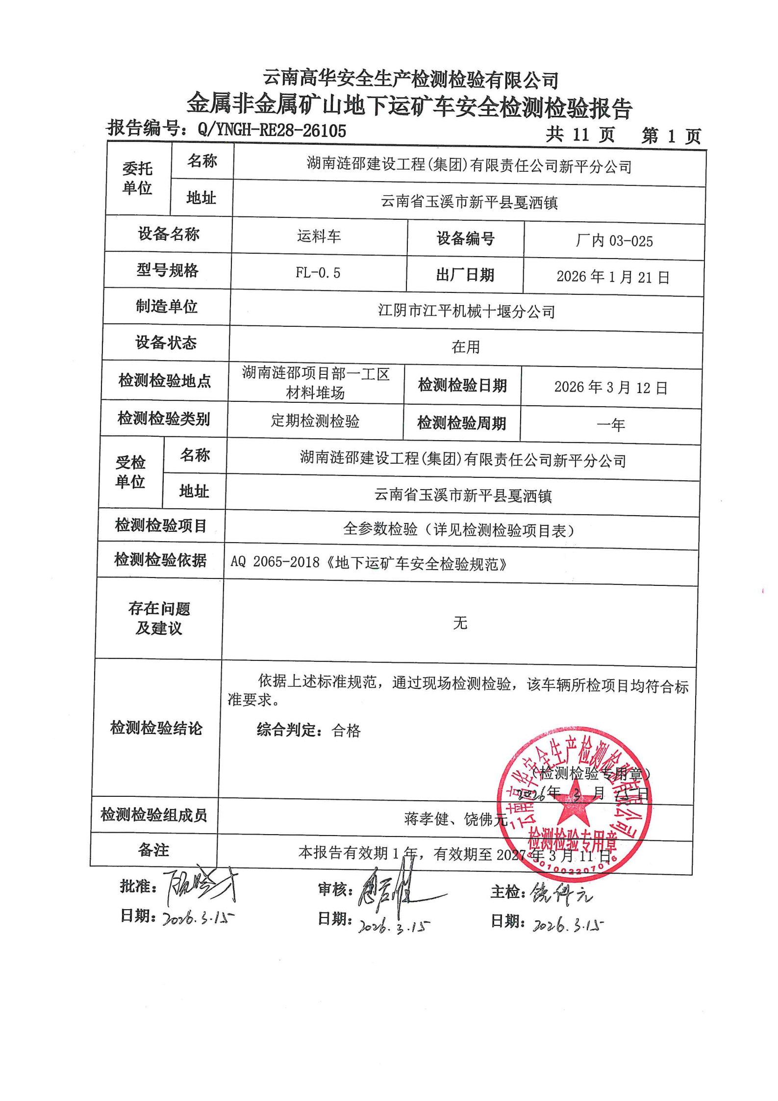金属非金属矿山地下运矿车安全检测检验报告