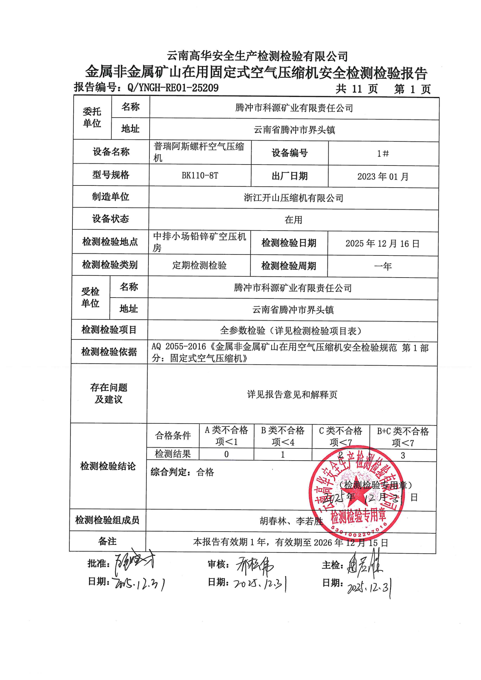 金属非金属矿山在用固定式空气压缩机安全检测检验报告
