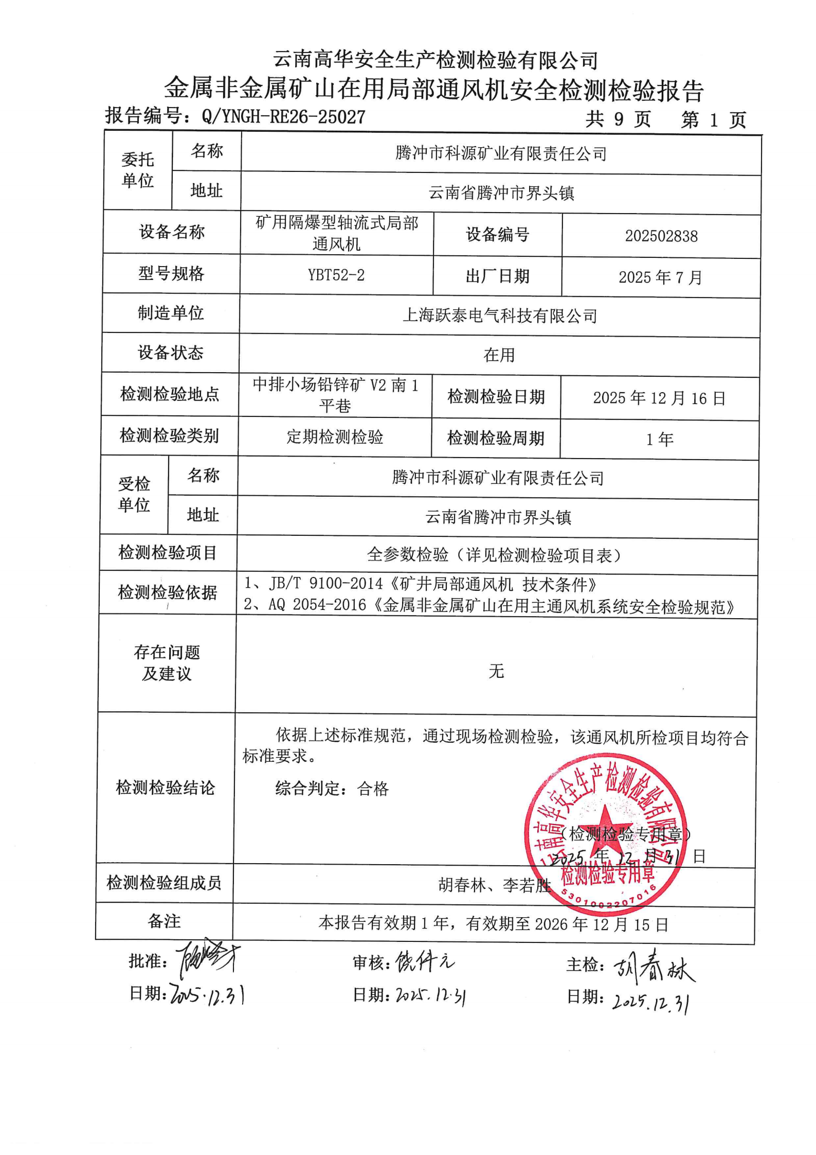 金属非金属矿山在用局部通风机安全检测检验报告
