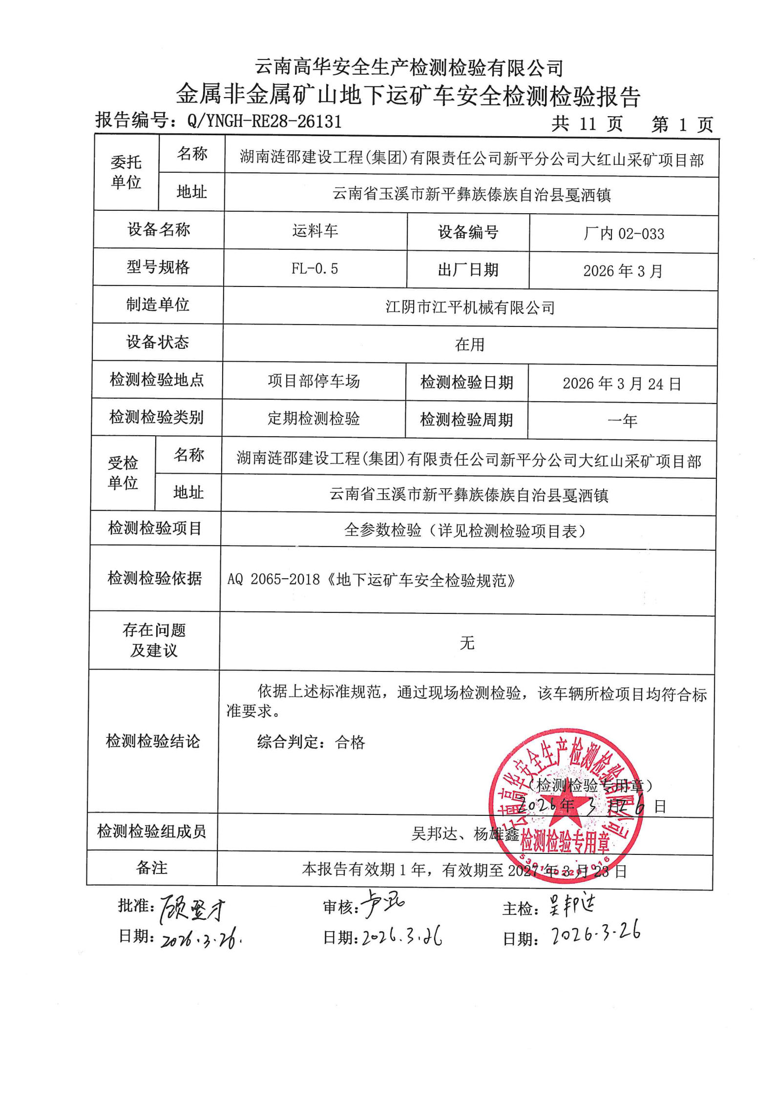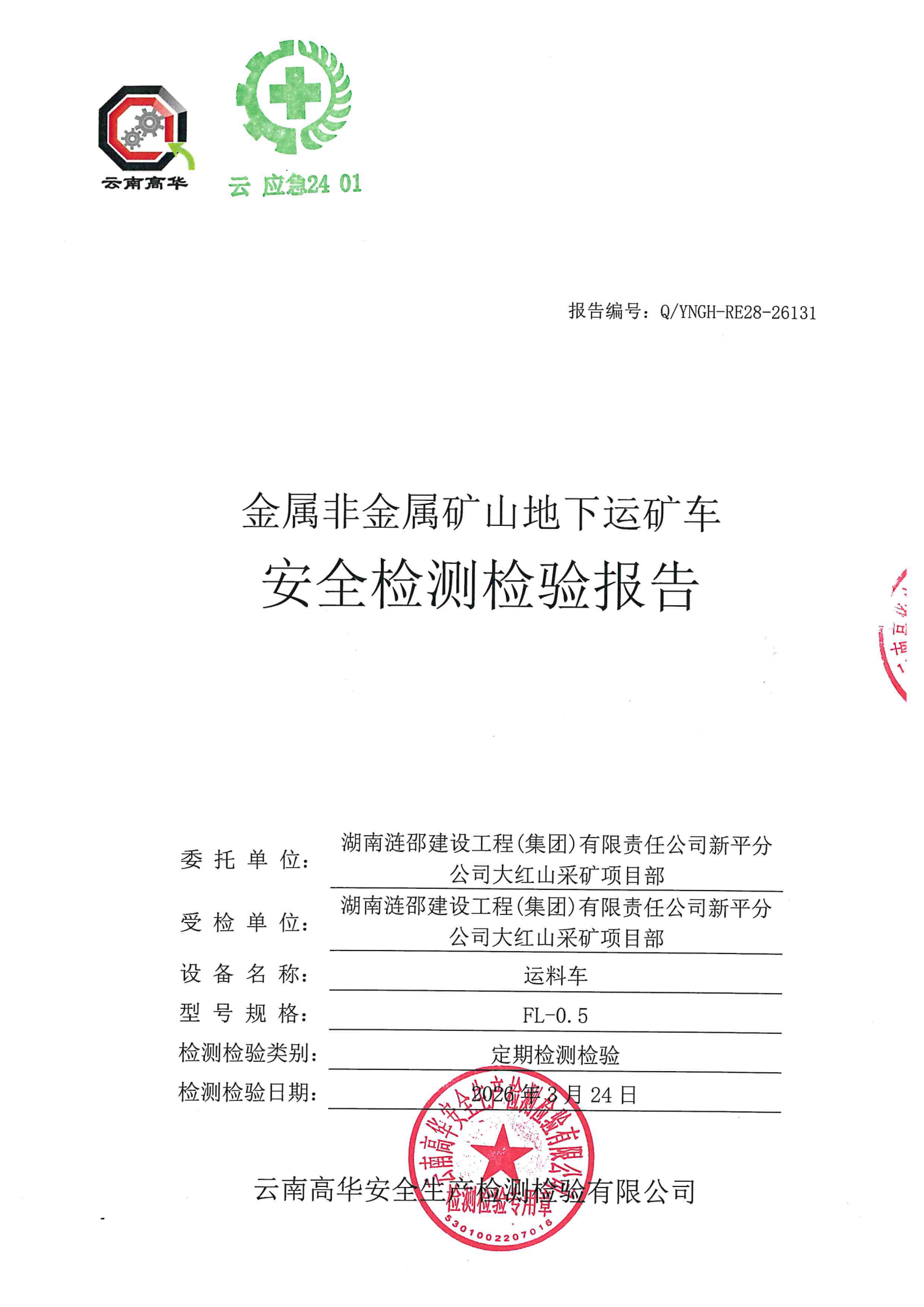 金属非金属矿山地下运矿车安全检测检验报告