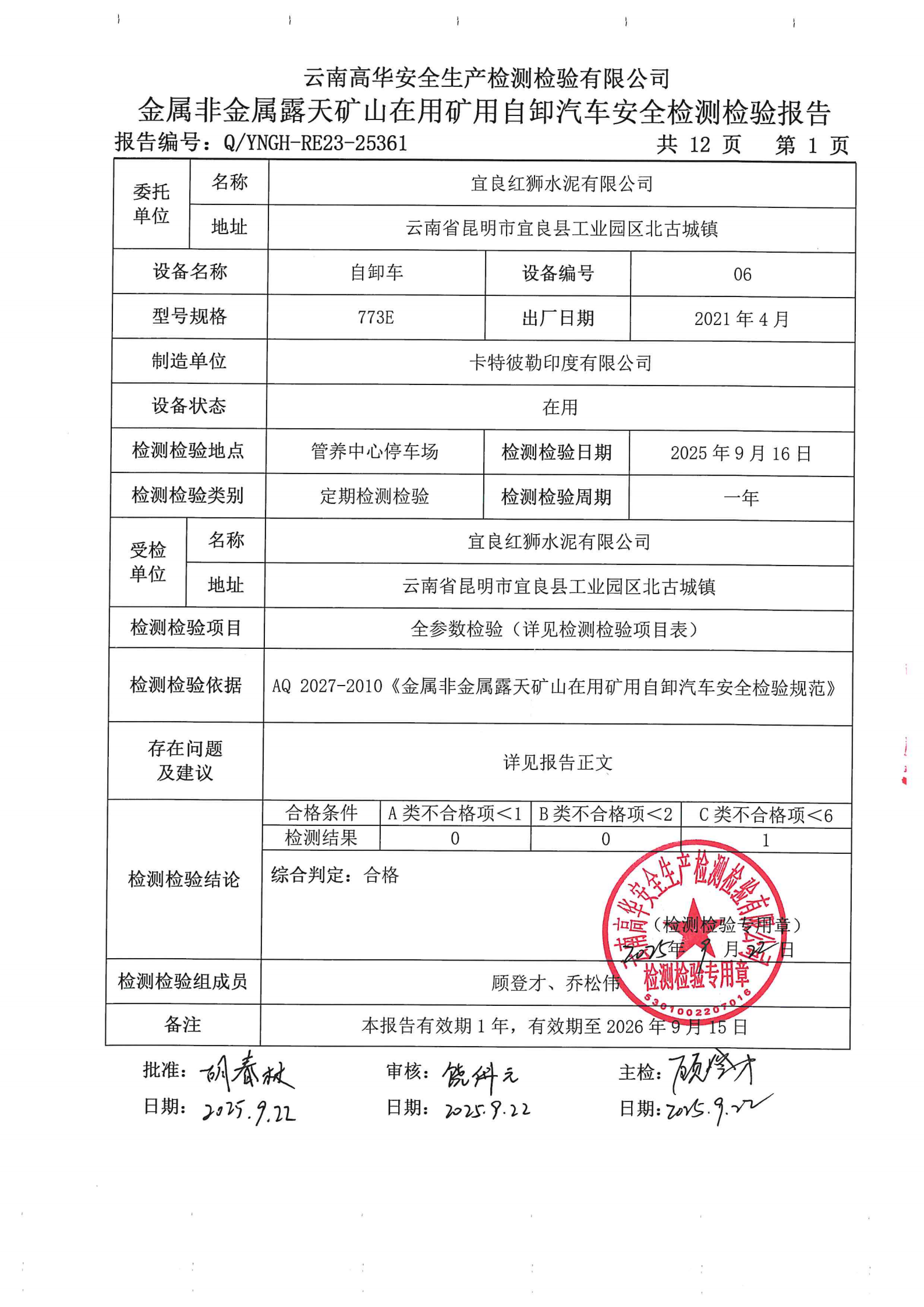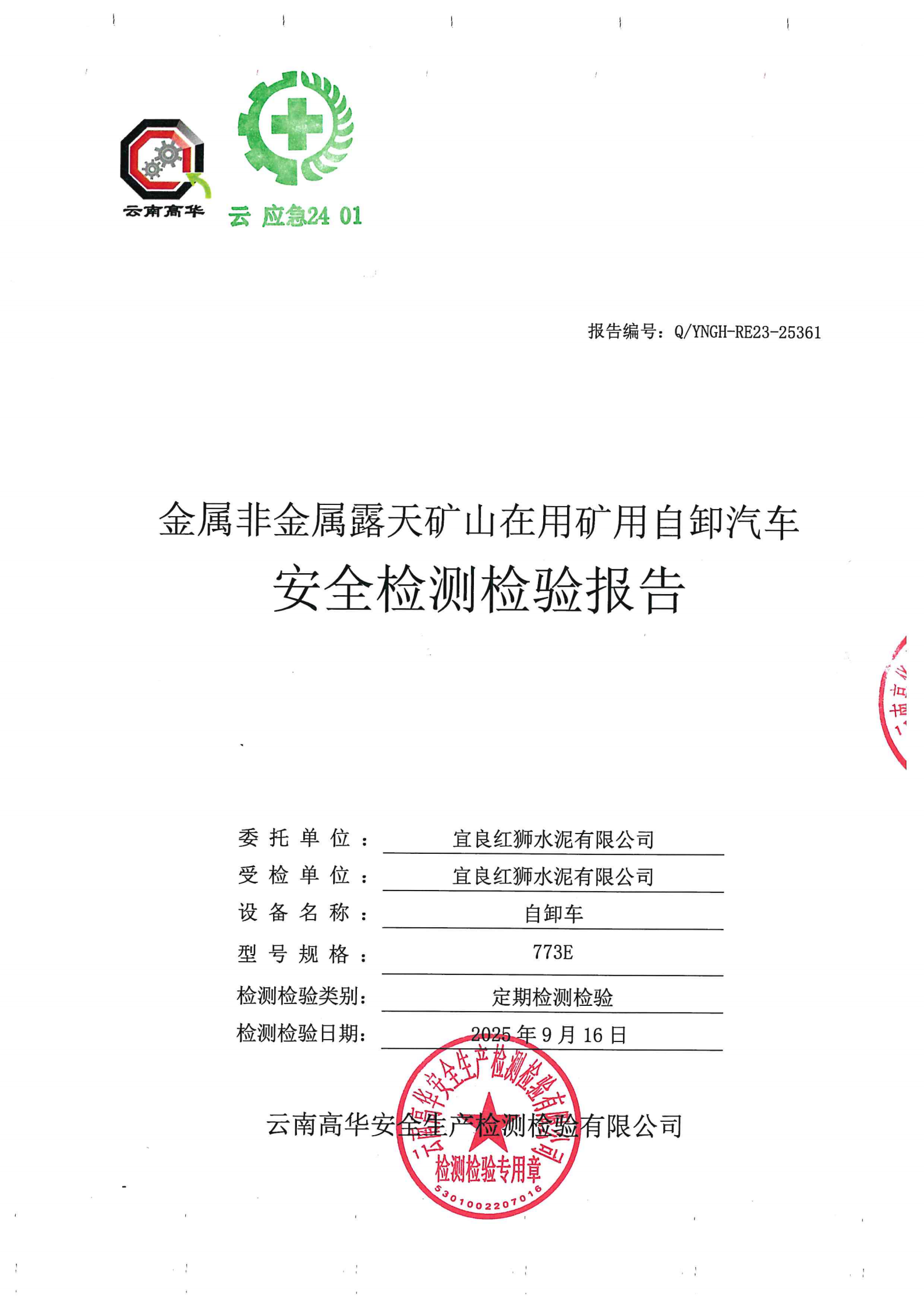 金属非金属露天矿山在用矿用自卸汽车安全检测检验报告
