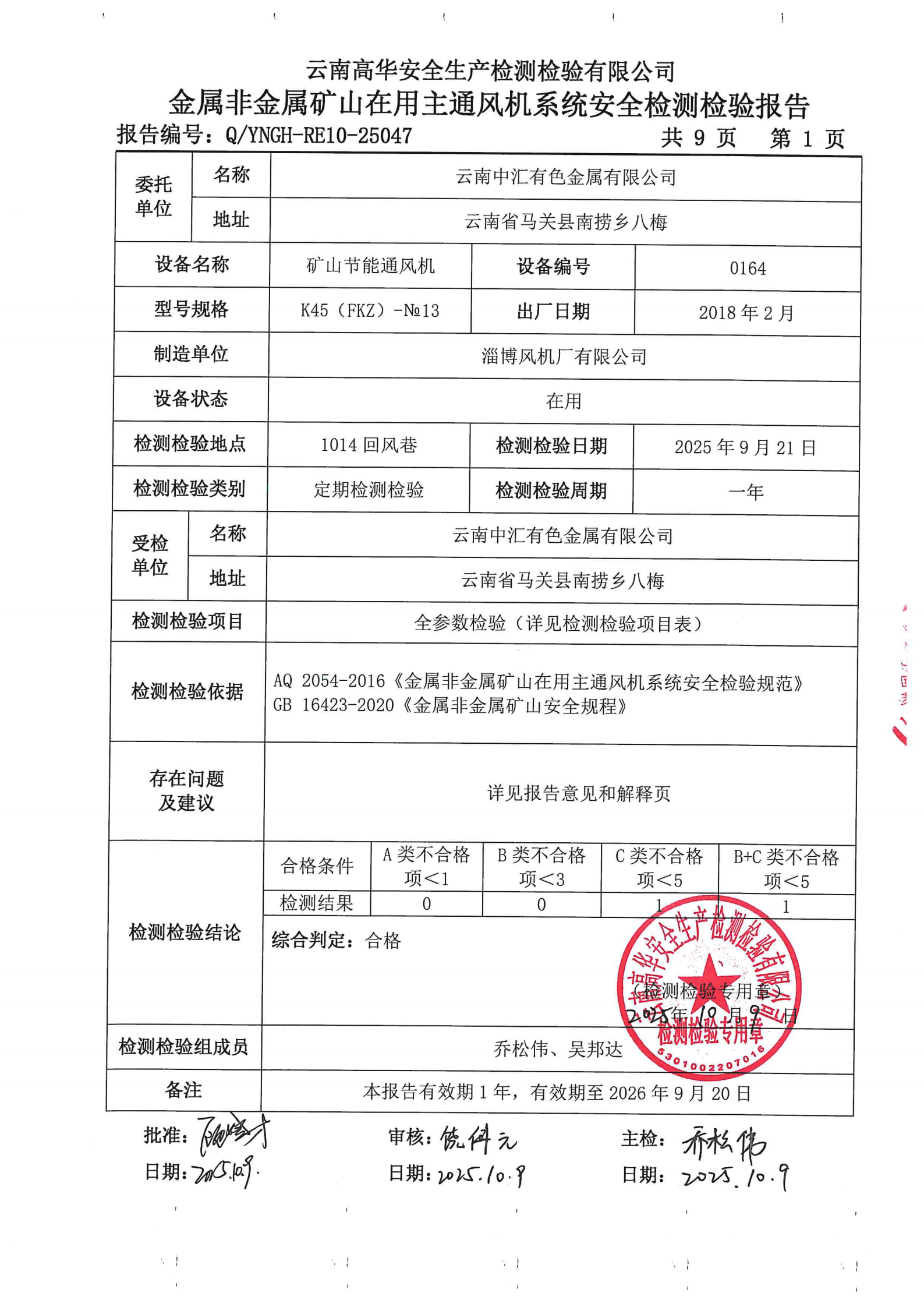 金属非金属矿山在用主通风机系统安全检测检验报告