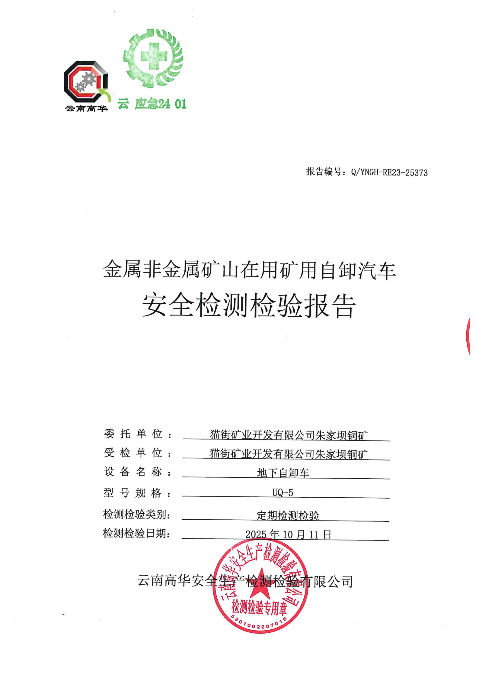 金属非金属矿山在用矿用自卸汽车安全检测检验报告