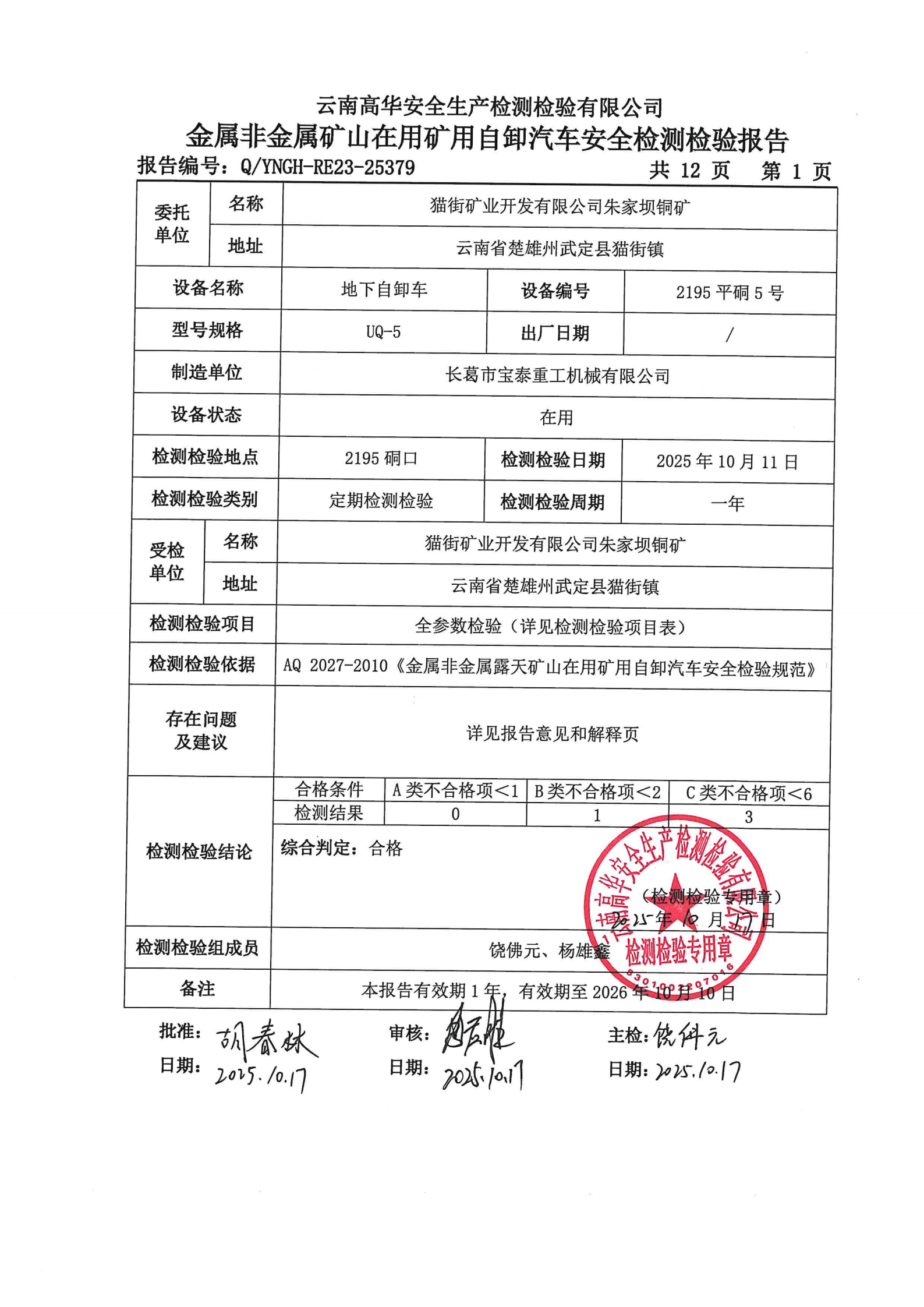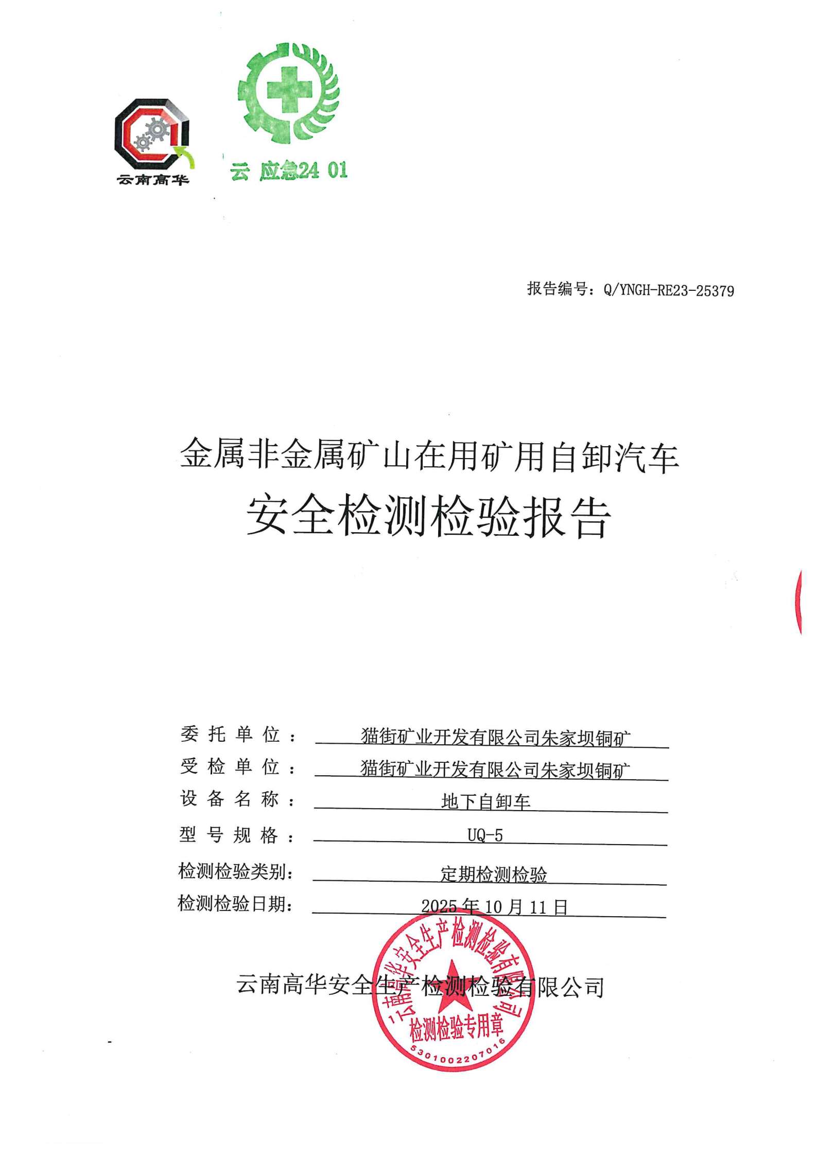 金属非金属矿山在用矿用自卸汽车安全检测检验报告