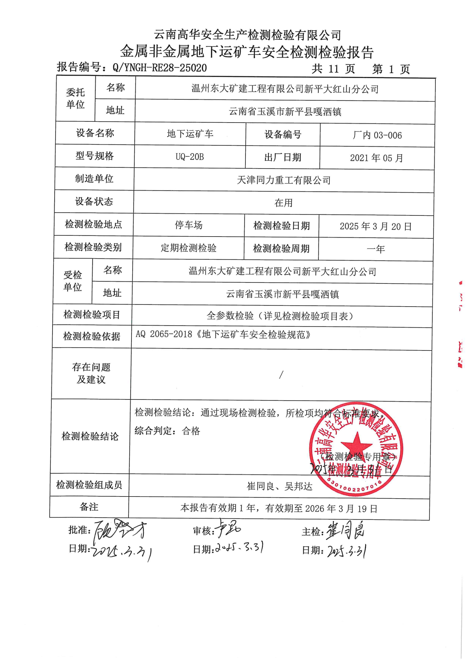 金属非金属矿山地下运矿车安全检测检验报告