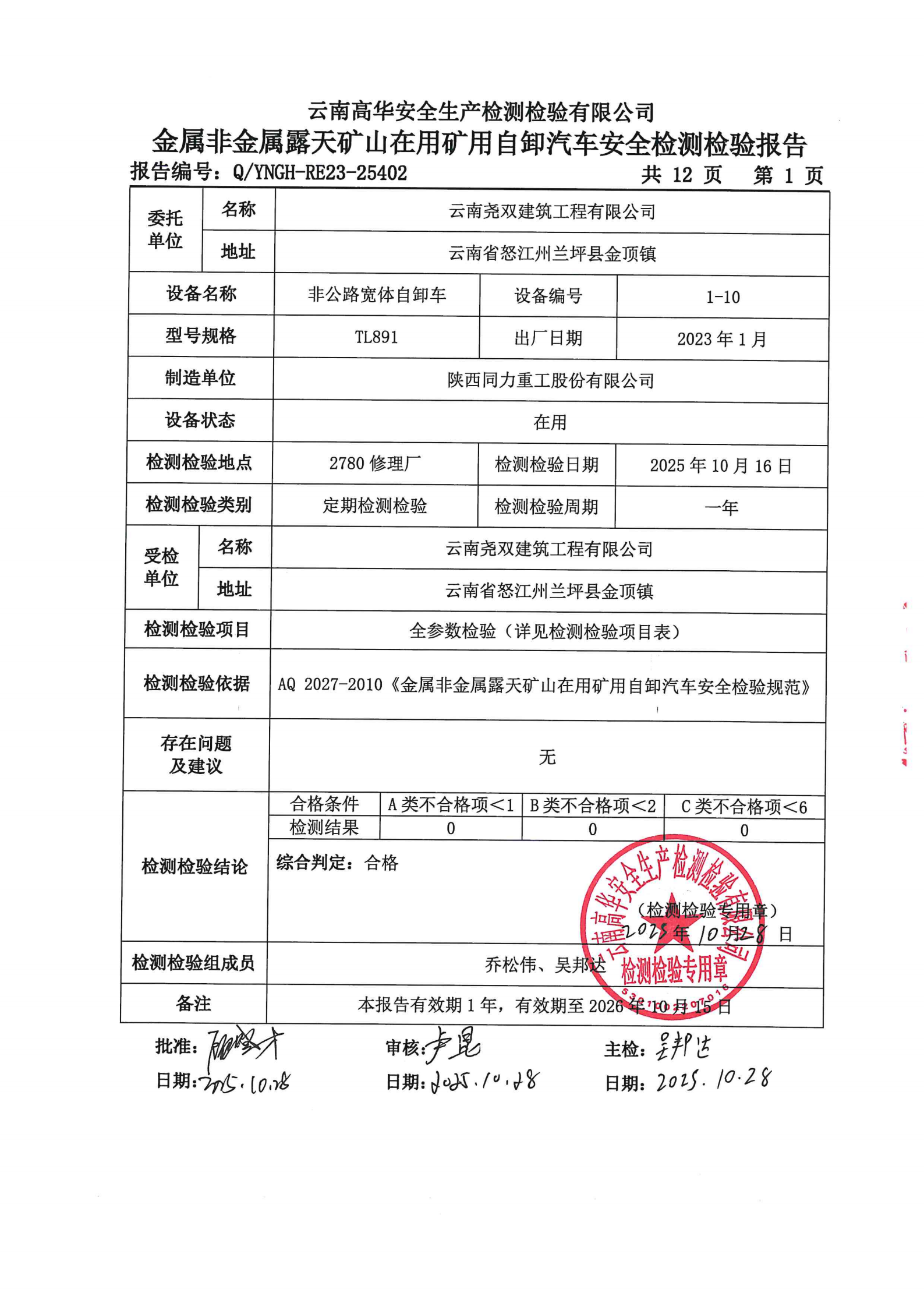 金属非金属露天矿山在用矿用自卸汽车安全检测检验报告