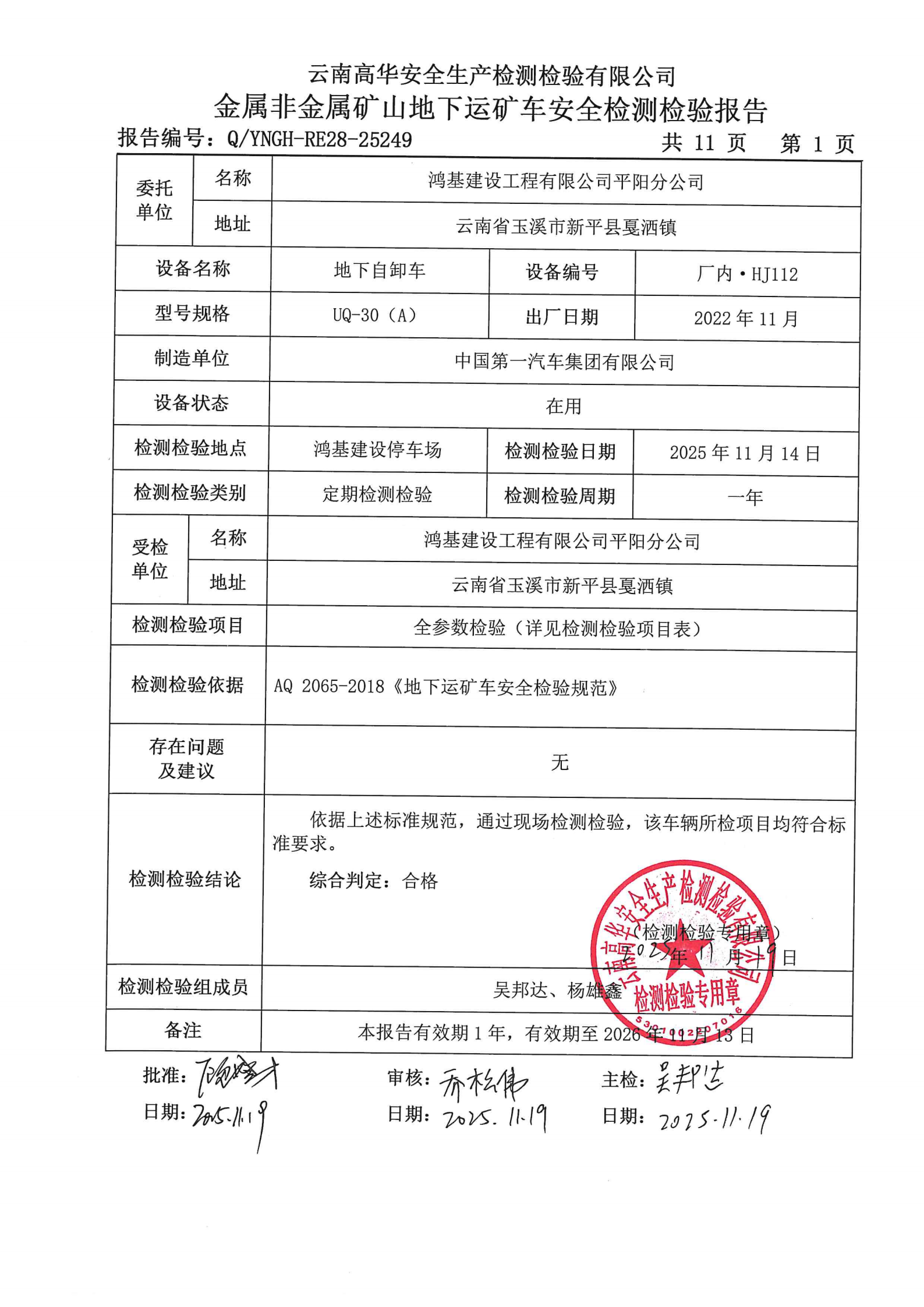 金属非金属矿山地下运矿车安全检测检验报告