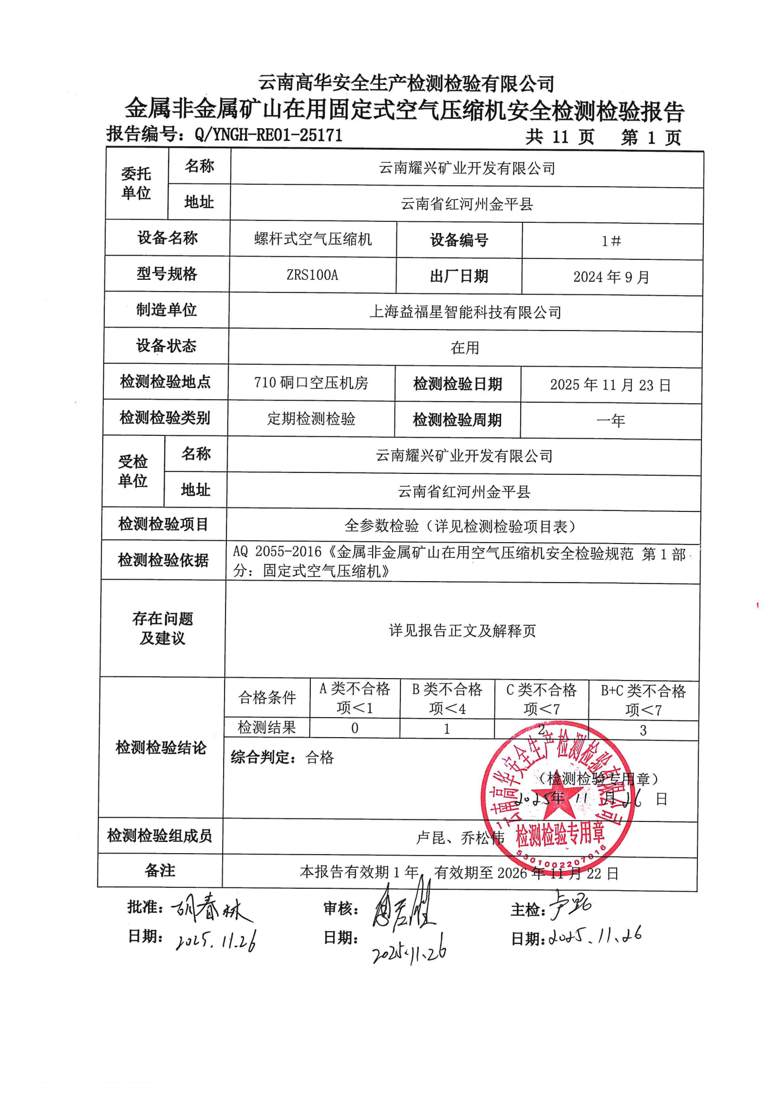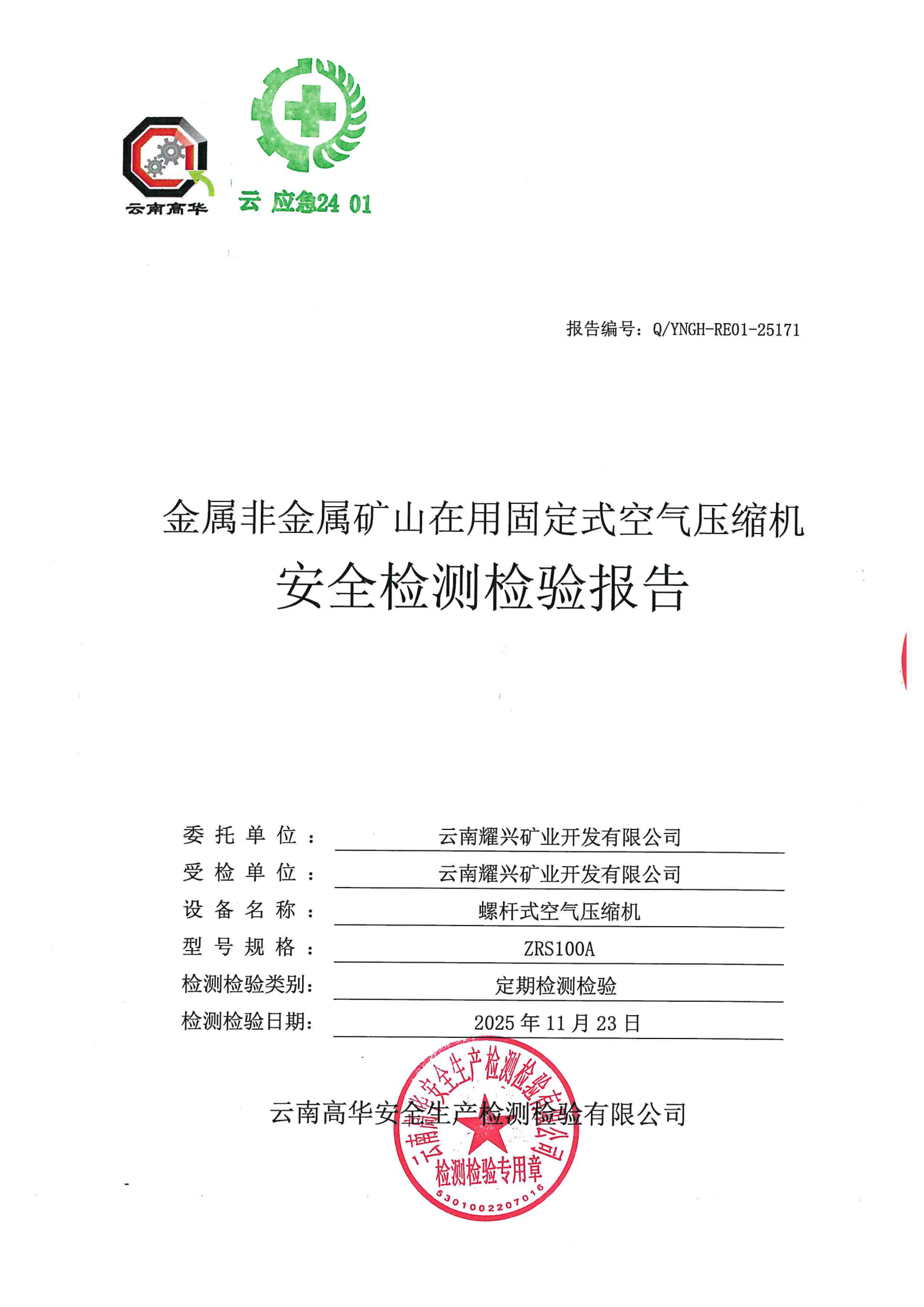 金属非金属矿山在用固定式空气压缩机安全检测检验报告