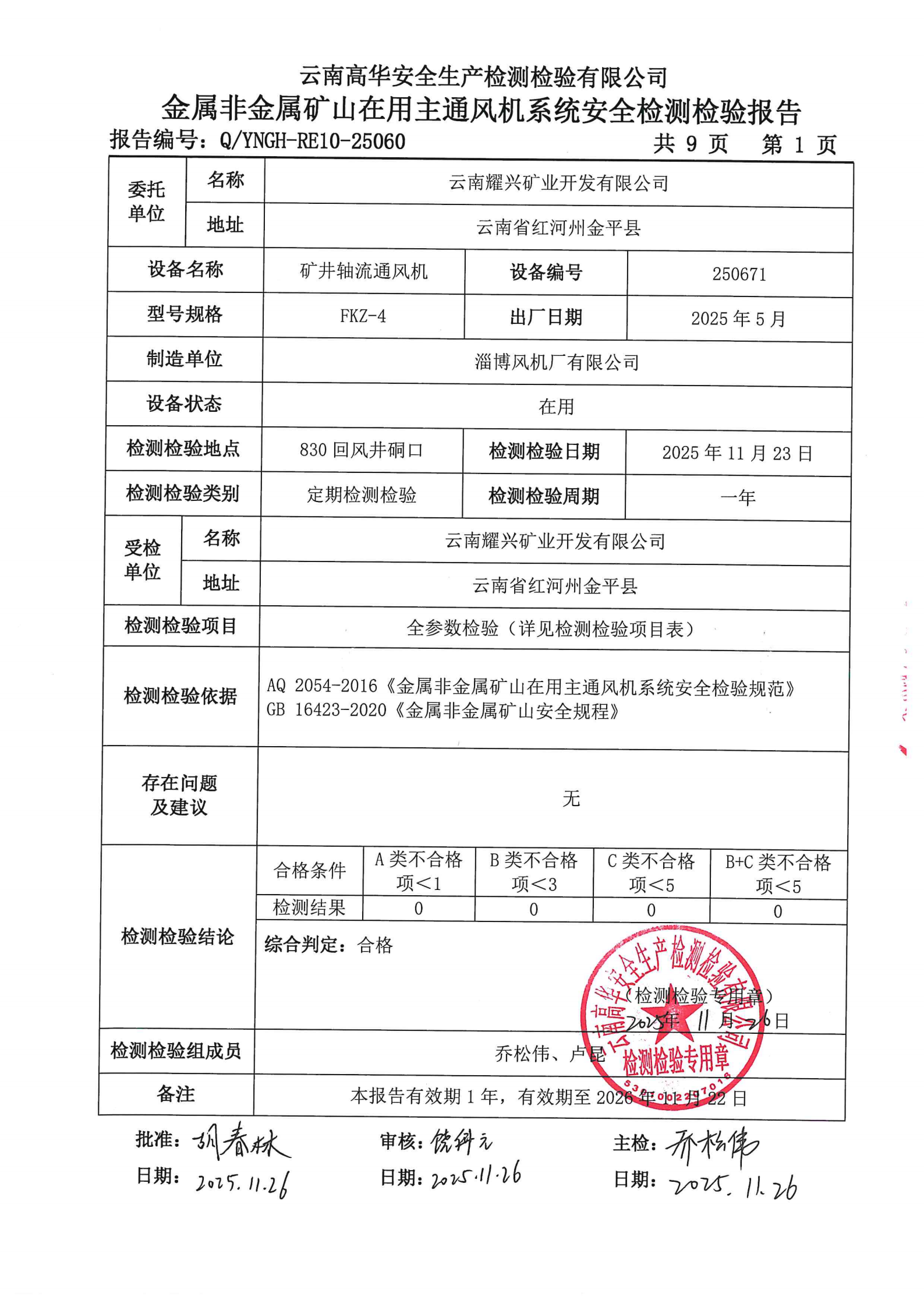 金属非金属矿山在用主通风机系统安全检测检验报告