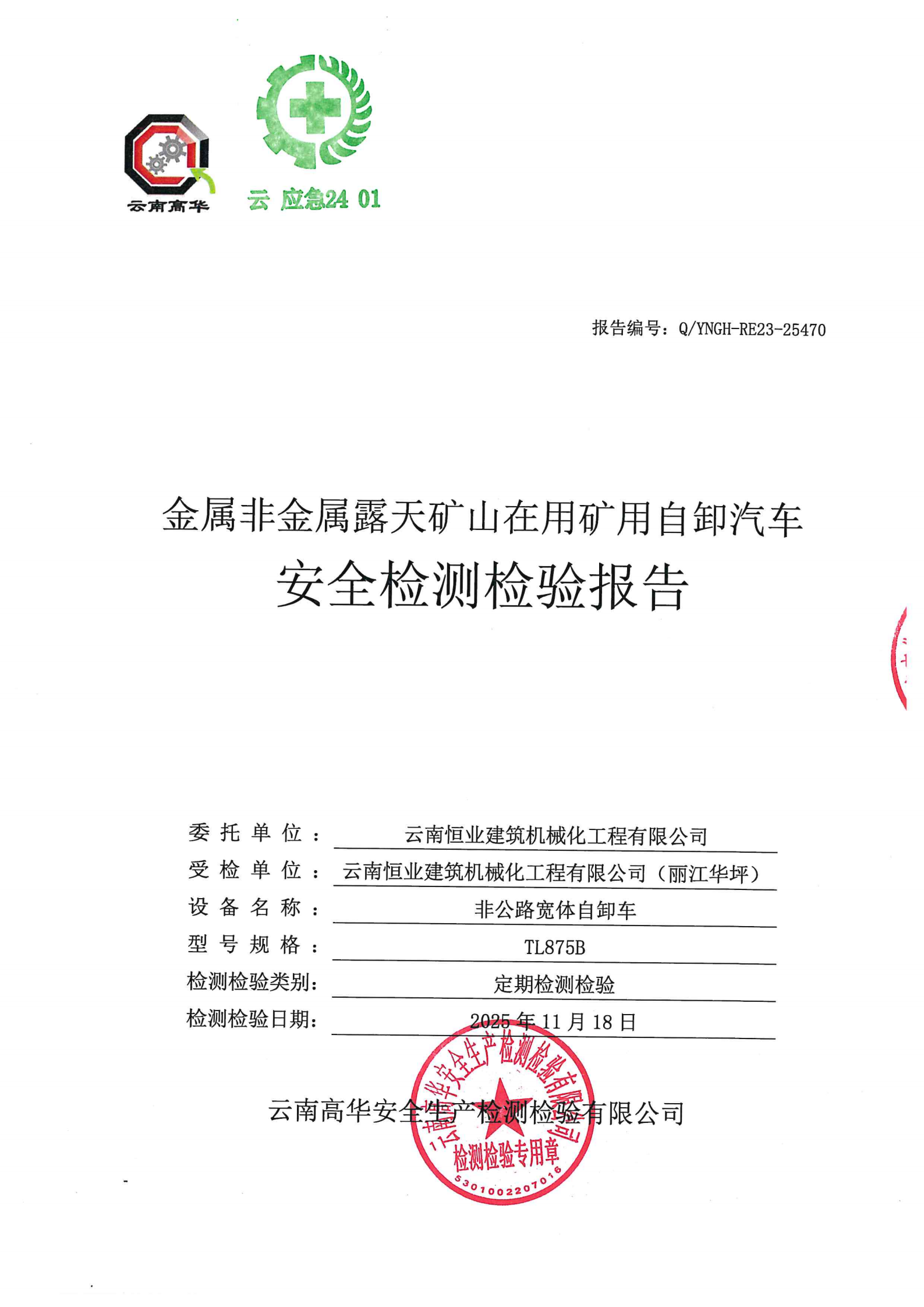 金属非金属露天矿山在用矿用自卸汽车安全检测检验报告