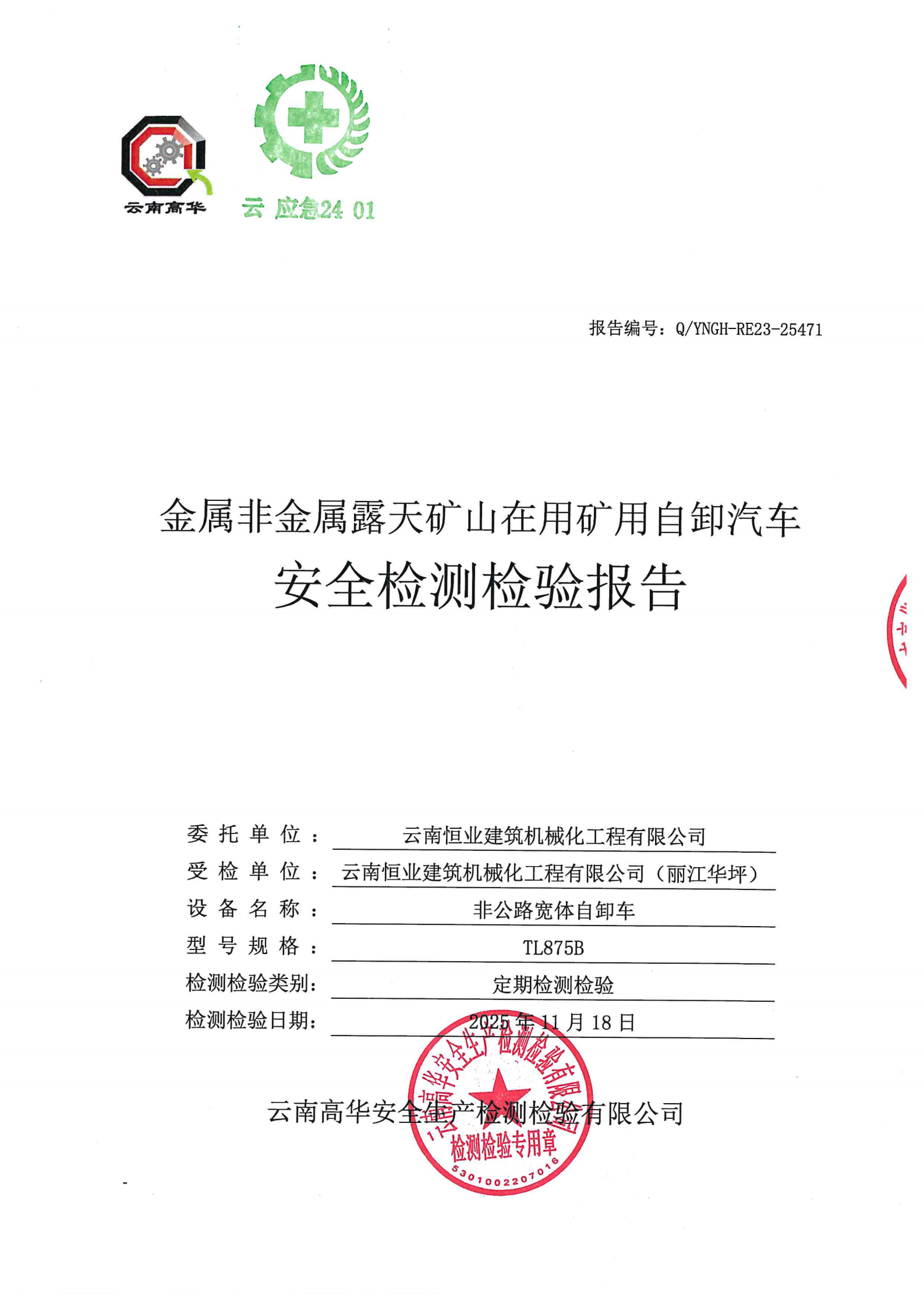 金属非金属露天矿山在用矿用自卸汽车安全检测检验报告