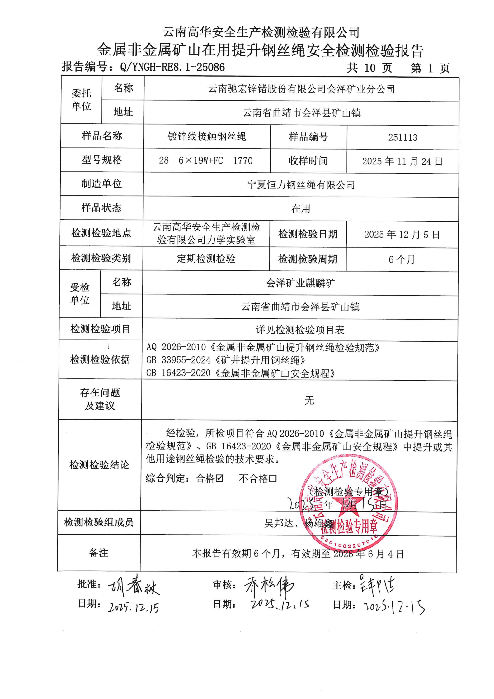金属非金属矿山在用提升钢丝绳安全检测检验报告