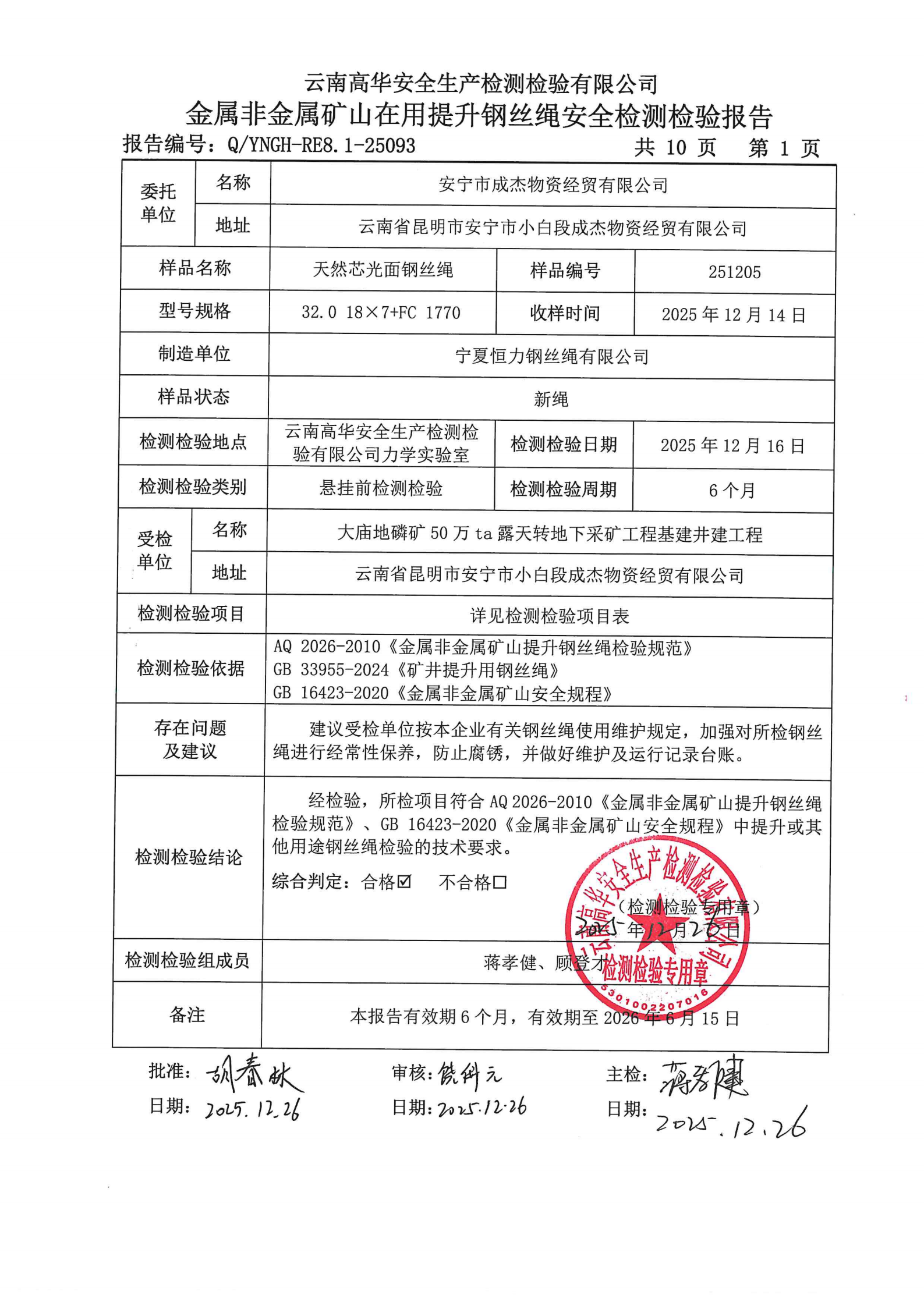 金属非金属矿山在用提升钢丝绳安全检测检验报告