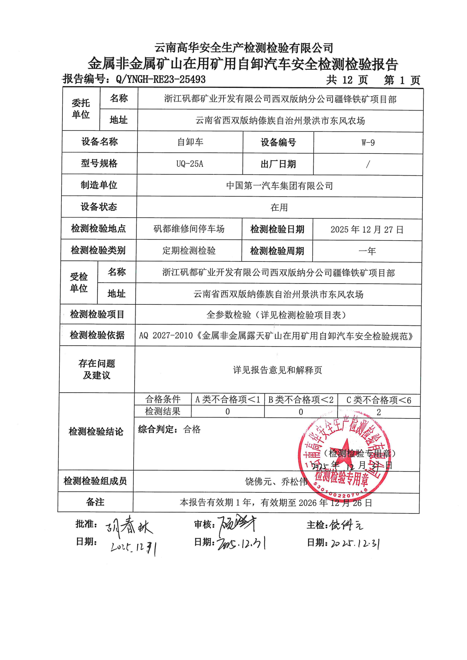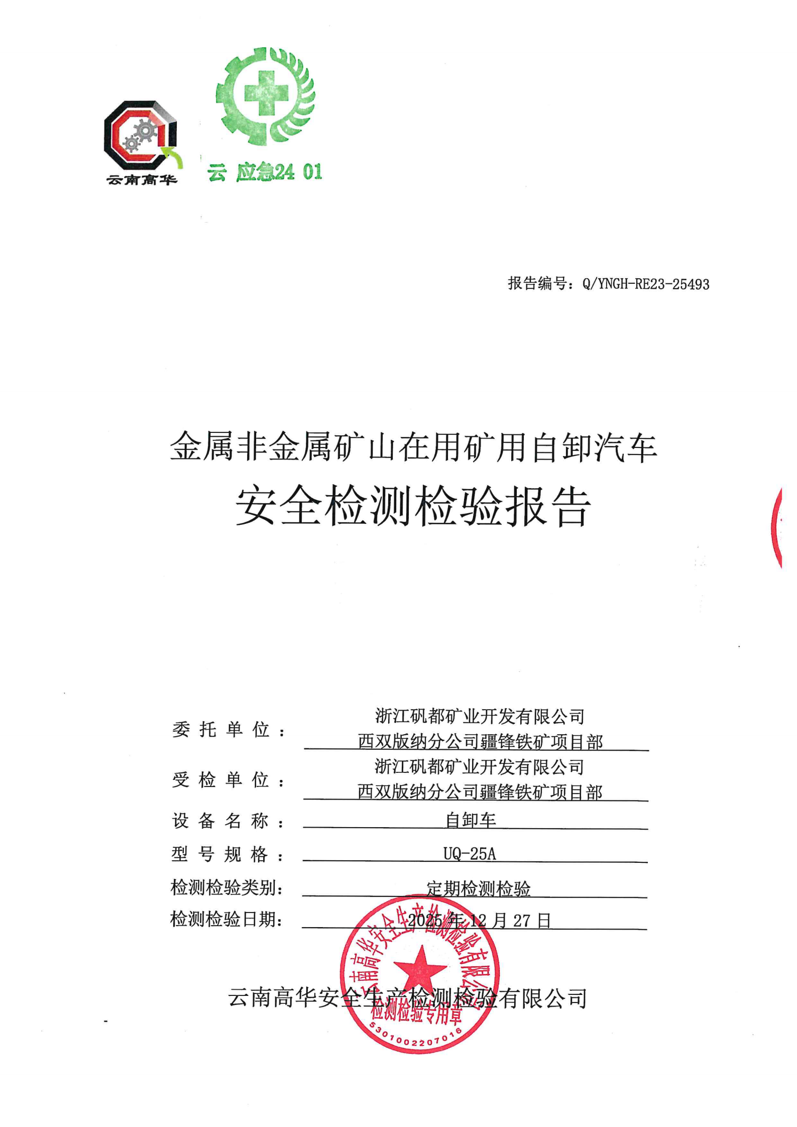 金属非金属矿山在用矿用自卸汽车安全检测检验报告