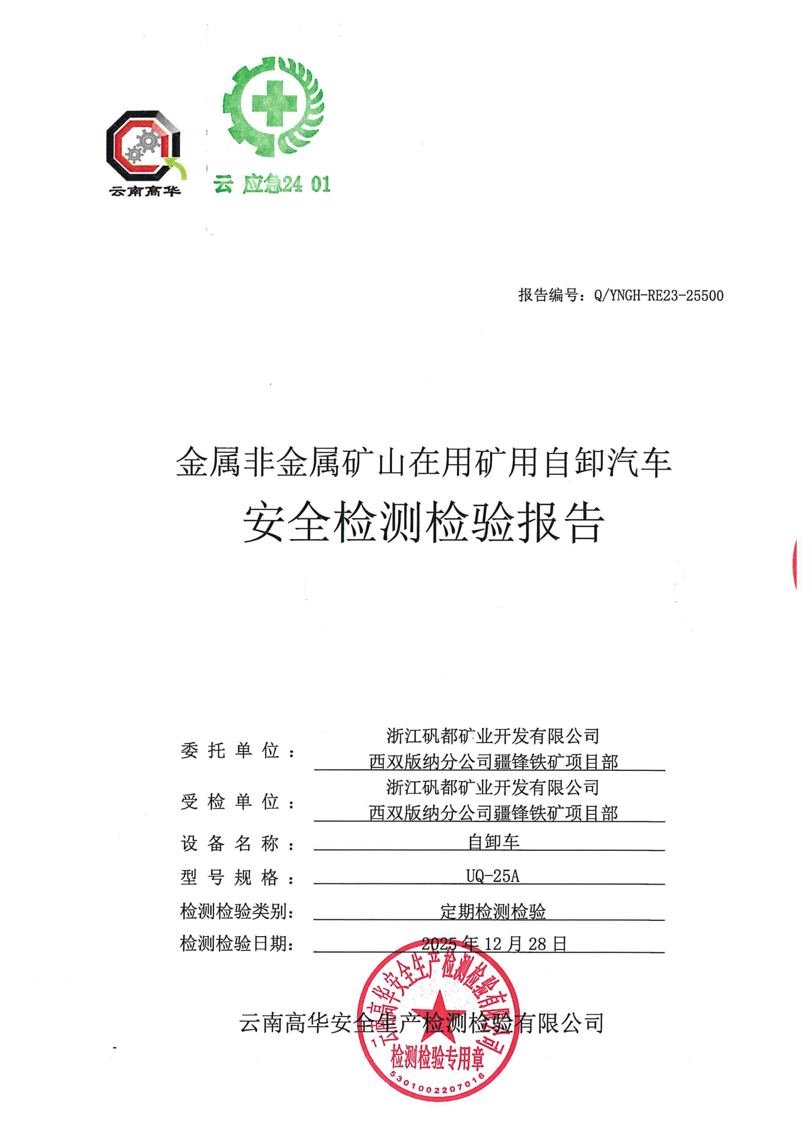 金属非金属矿山在用矿用自卸汽车安全检测检验报告