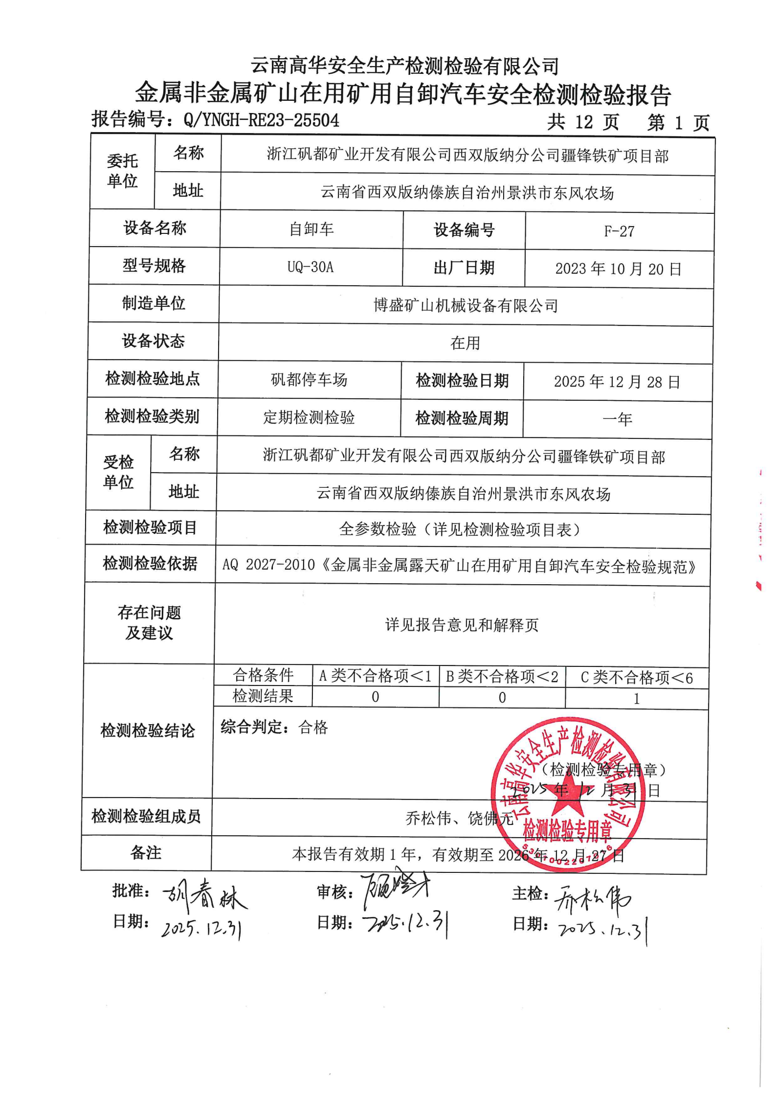 金属非金属矿山在用矿用自卸汽车安全检测检验报告