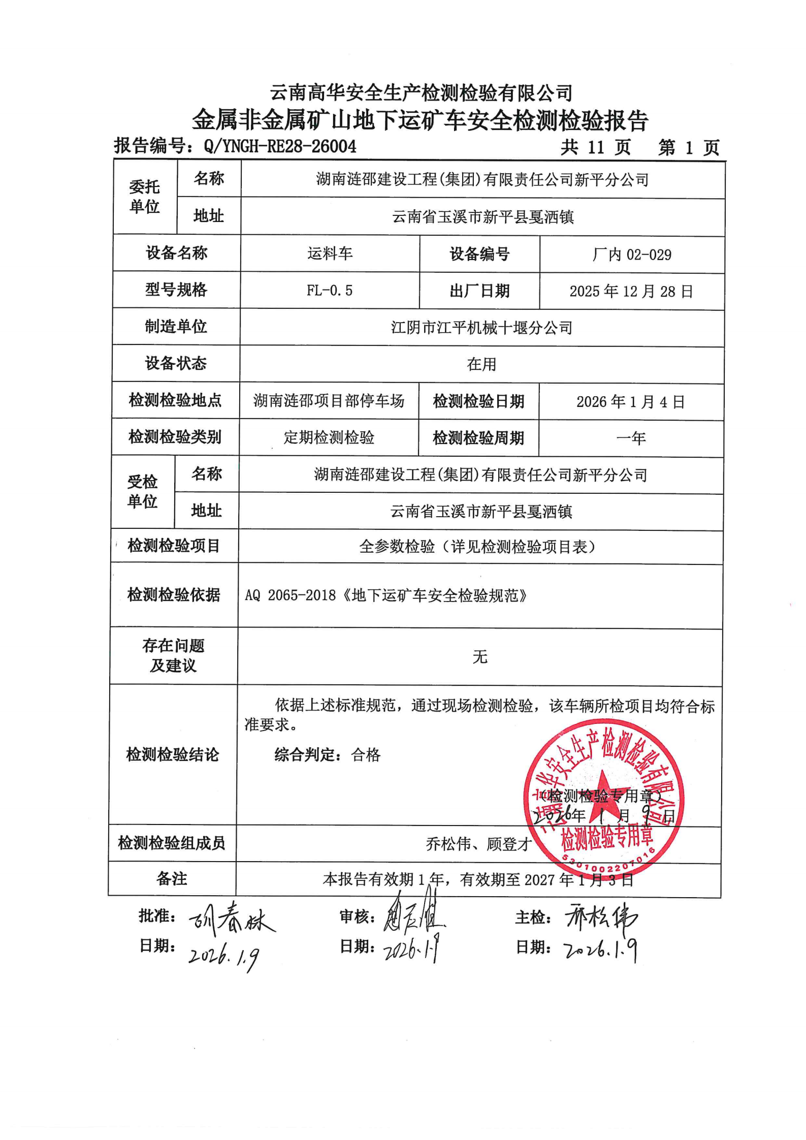 金属非金属矿山地下运矿车安全检测检验报告