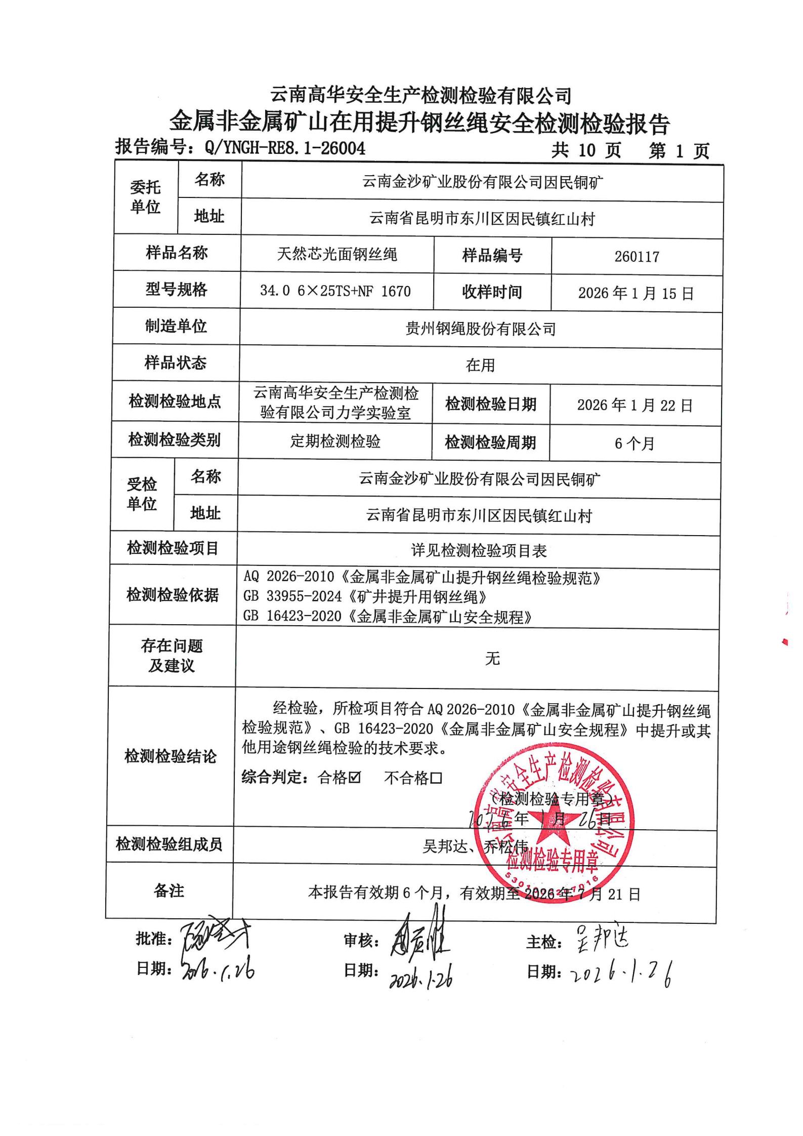 金属非金属矿山在用提升钢丝绳安全检测检验报告