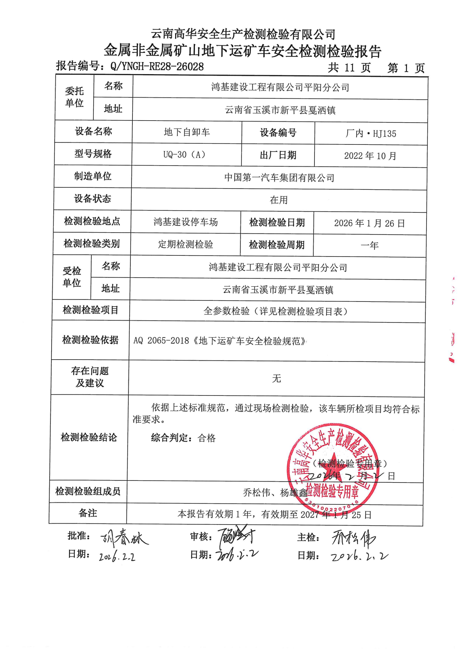 金属非金属矿山地下运矿车安全检测检验报告