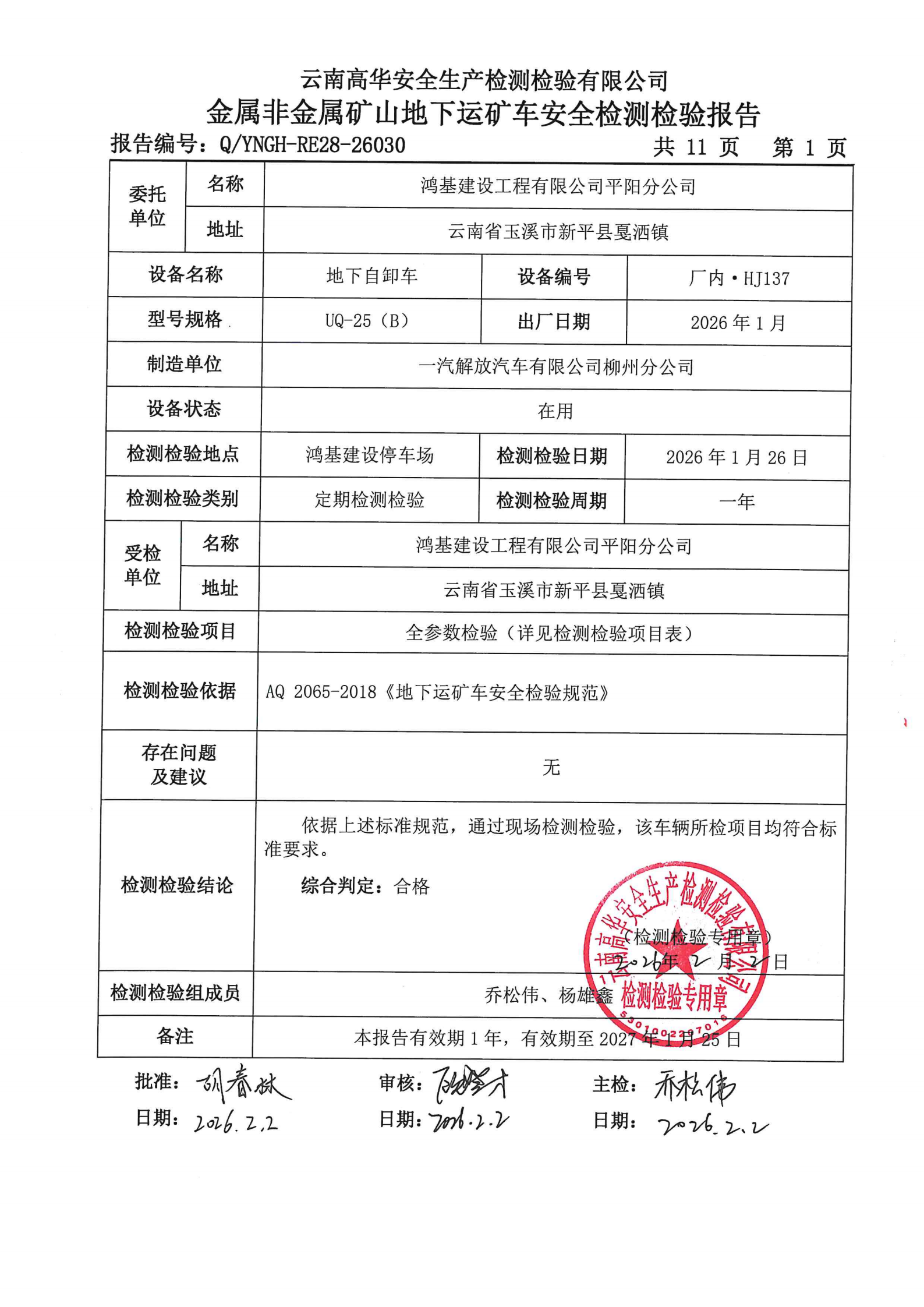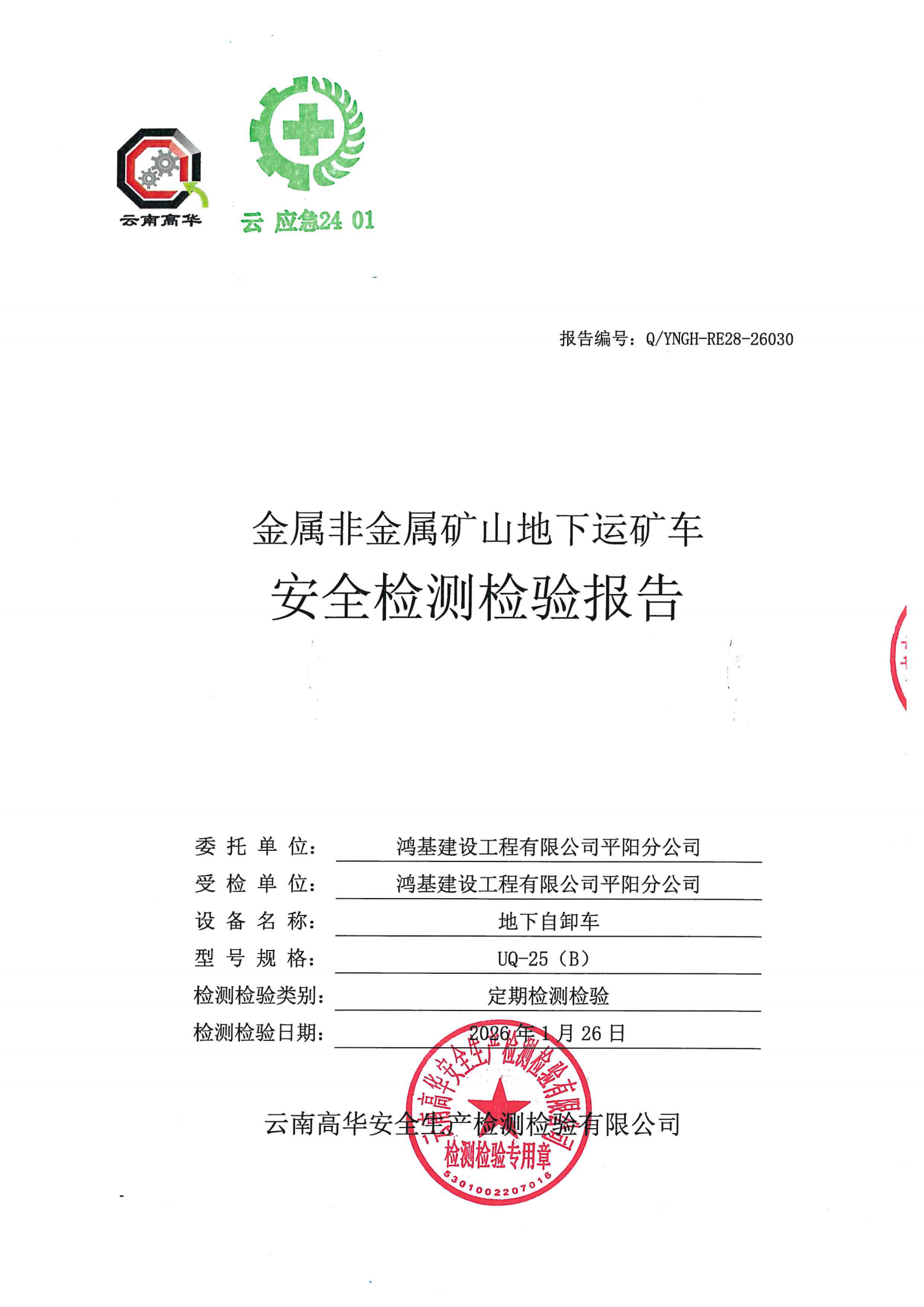 金属非金属矿山地下运矿车安全检测检验报告