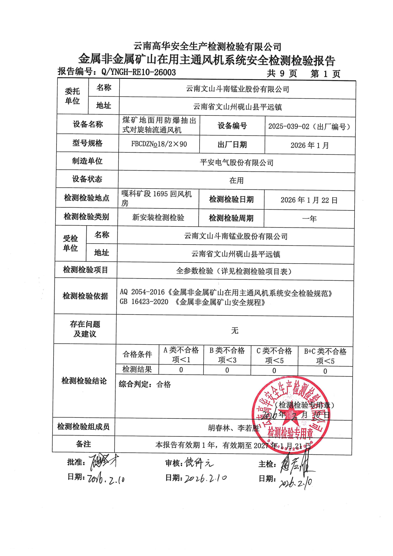 金属非金属矿山在用主通风机系统安全检测检验报告